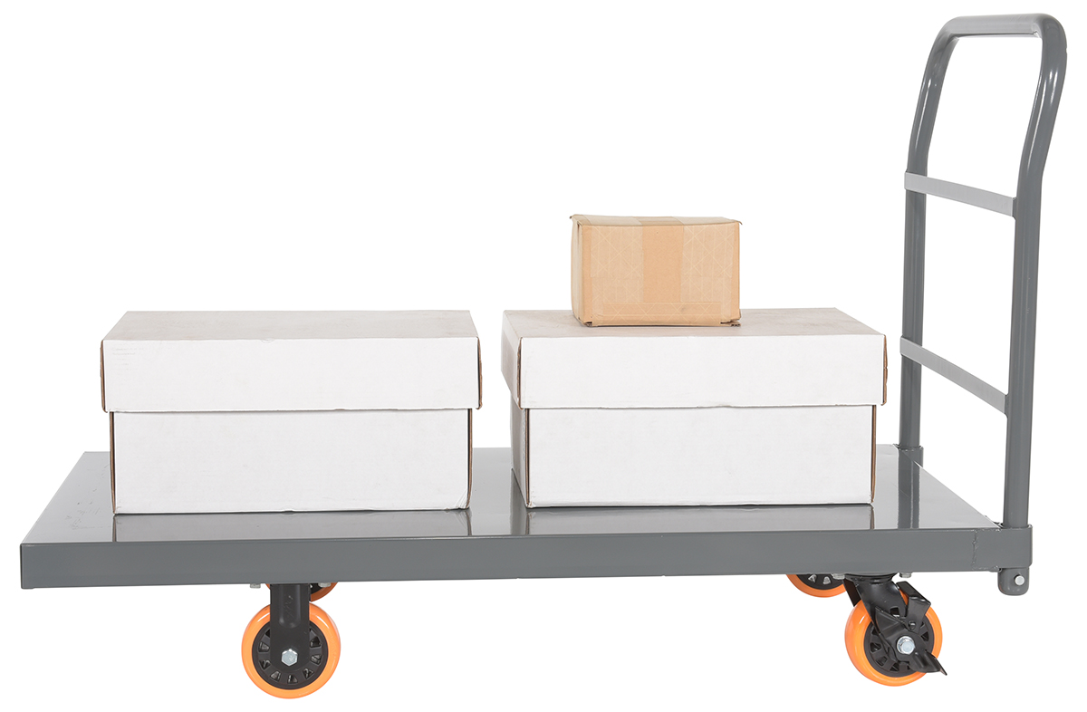 This steel platform truck with a solid, smooth steel deck is all welded and features structural reinforcement underneath for extra strength. It includes one (1) removable high-polished steel handle and rolls smoothly casters. Comes standard with a floor lock.