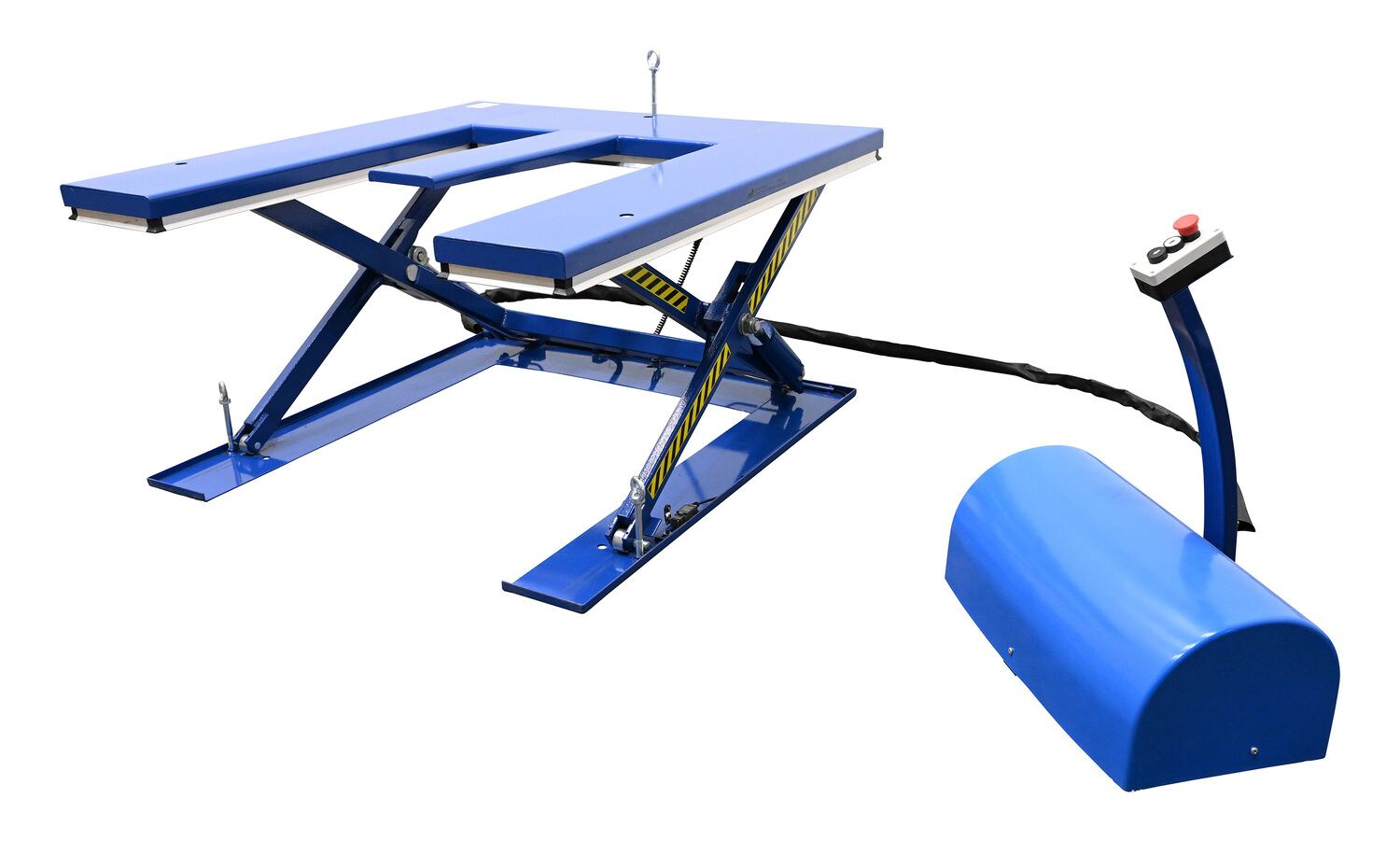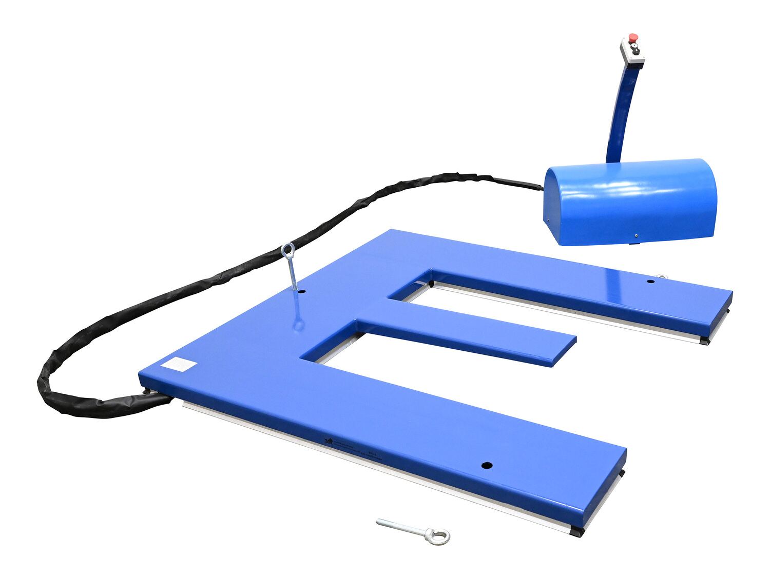 Steel Low Profile Electric Lift Table E Type 56 In. x 52-3/4 In. x 3-1/2 In. 2000 Lb. Capacity BlueThe low profile electric lift tables are ideal for manufacturing and distribution facilities. The unique, steel constructed "E" design provides a center support beam to prevent the lifted product from deflecting downward in the center. Numerous protective features include electric toe guards, velocity cylinders, and emergency stop buttons, providing personnel with the utmost safety. An external power pack is equipped with a pressure relief valve which prevents overloading while controlling lowering speed. To raise and lower the unit, simply utilize the "up and down" push button design on the 24V control box for precise ergonomic positioning of product.