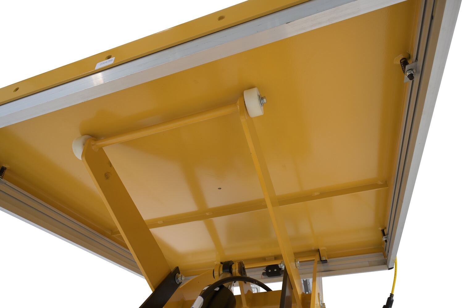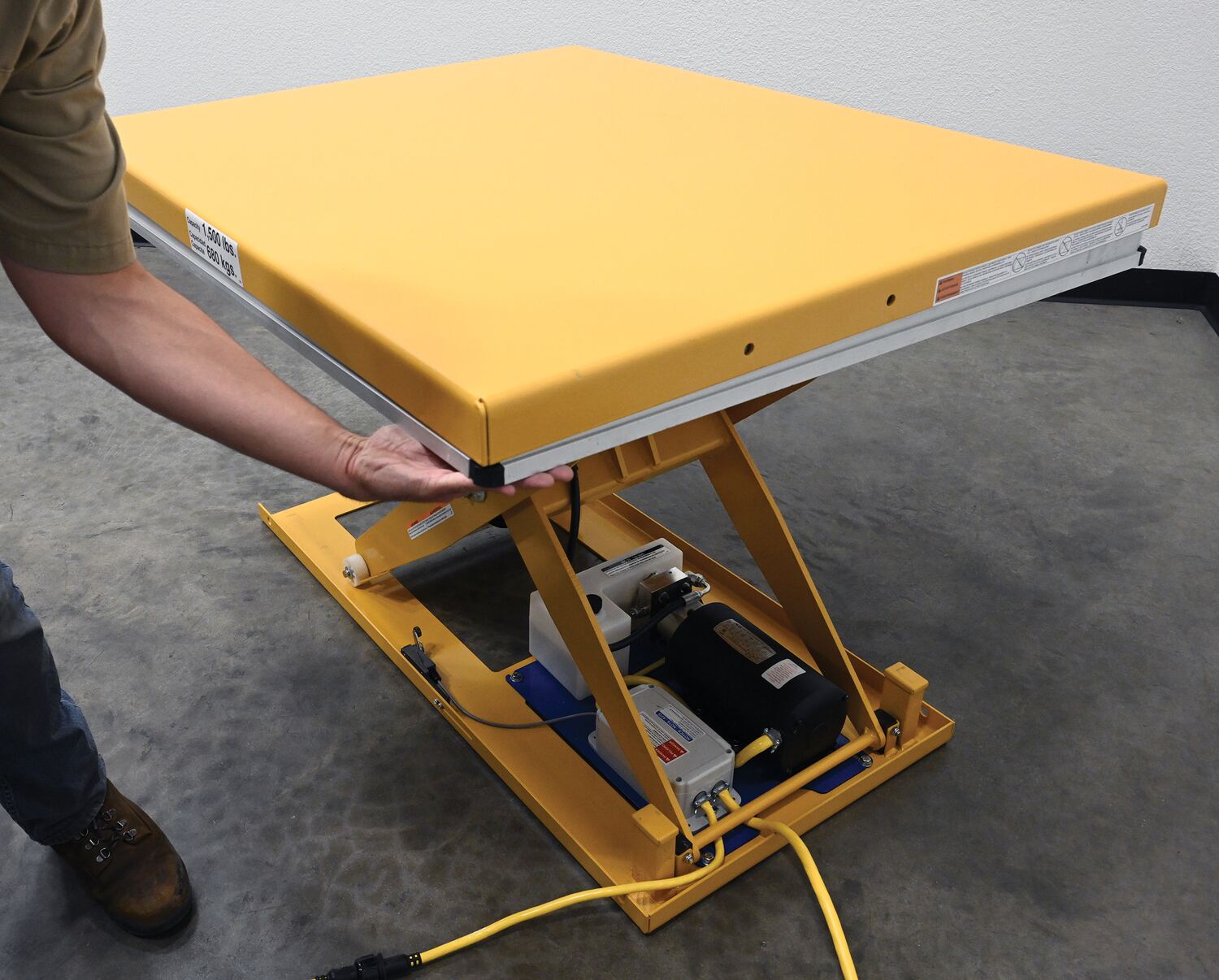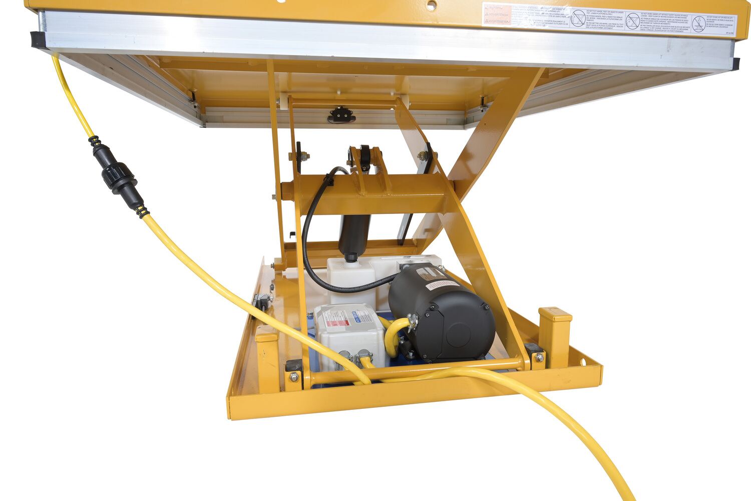 Steel Electric Hydraulic Scissor Table 40"x48" With Internal Power Unit 1,500 Lb. Capacity YellowThe work station electric hydraulic scissor table is designed to raise products up to an ergonomic working height. It maximizes safety with minimum space requirements and is ideal for all types of manufacturing and warehouse facilities. The 460V 3-phase internal power unit comes with a standard hand control. An electric toe guard also comes standard for pinch point protection.