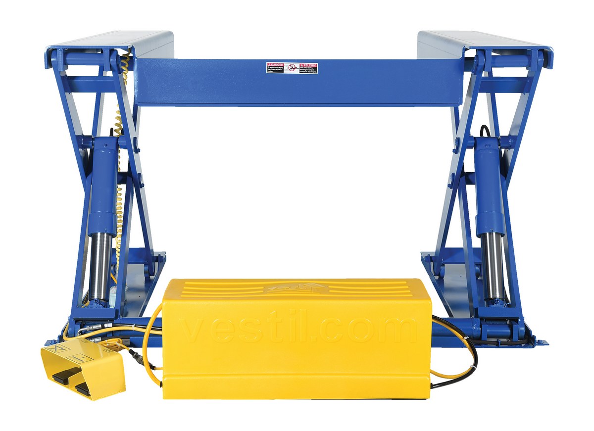 Steel Ground Lift Scissor Table 44 In. x 50 In. 4000 Lb. Capacity BlueThe ground lift scissor table is designed for use when fork trucks are not available. The pallets can be loaded onto the platform with pallet trucks and raised to an ergonomic working height. Safety features include an entry-side electric toe guard to protect pinch points during lowering of the table, velocity fuse to maintain platform height in the event of a hose or fitting failure, foot control, maintenance prop, and upper travel limit switch to stop the table at maximum height reducing motor wear. The motor is totally enclosed standard with additional voltage options available. The remote power unit can be located up to eight (8) feet away from the table. Optional accordion skirting is available.