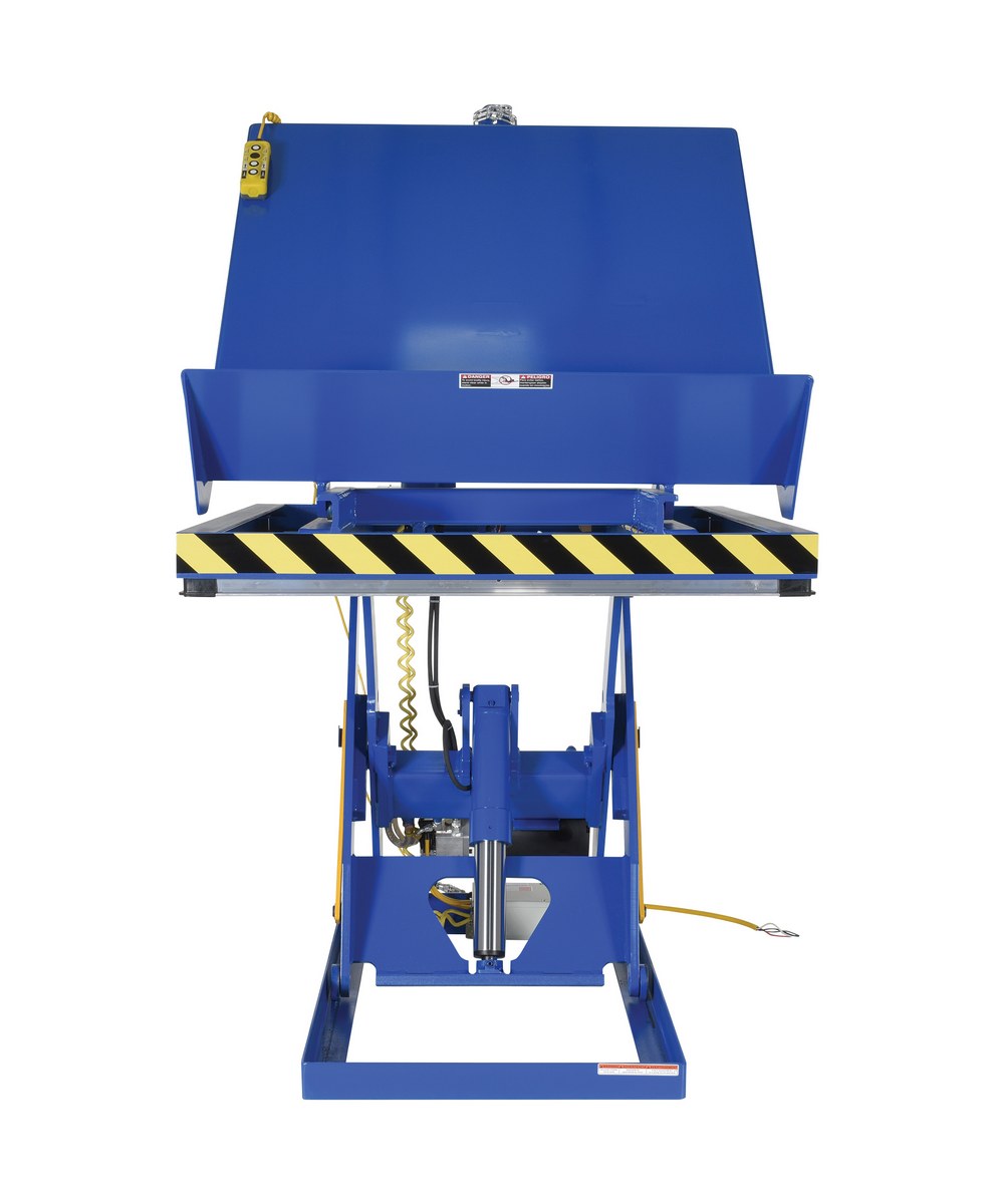 Steel Lift and End Tilt Scissor Table 48 In. x 48 In. 1000 Lb. Capacity BlueThe lift and tilt scissor lift performs both lifting and tilting operations. There is a restraining chain and lip to keep the load in place during tilting. Safety features include an electric toe guard to protect workers from pinch points during lowering of the table, velocity fuses to hold platform position in the event of a hose or fitting failure, four (4) push-button hand pendent control, upper limit switch to stop travel at maximum height and reduce motor wear, and maintenance prop. The end tilt is standard with a side tilt available. There is optional accordion skirting available for both the lifting and tilting portions of the table.
