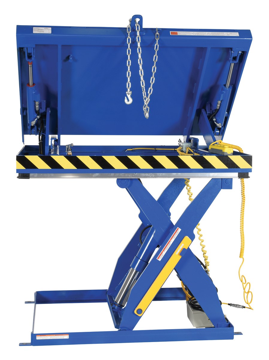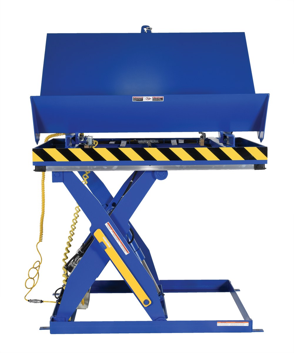 Steel Lift and Side Link Tilt Scissor Table 36 In. x 54 In. 2000 Lb. Capacity BlueThe lift and tilt scissor lift performs both lifting and tilting operations. There is a restraining chain and lip to keep the load in place during tilting. Safety features include an electric toe guard to protect workers from pinch points during lowering of the table, velocity fuses to hold platform position in the event of a hose or fitting failure, four (4) push-button hand pendent control, upper limit switch to stop travel at maximum height and reduce motor wear, and maintenance prop. The end tilt is standard with a side tilt available. There is optional accordion skirting available for both the lifting and tilting portions of the table.