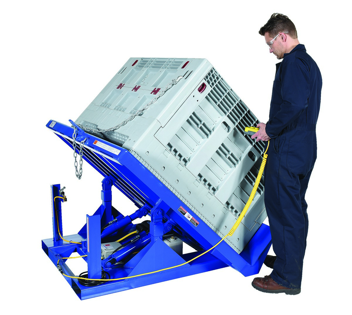 Steel Efficiency Master Tilt Table 60 In. x 50 In. 6000 Lb. Capacity BlueThe efficiency master tilt table tilts pallets, crates, boxes, or baskets to facilitate easy container loading or unloading. The table features all welded steel construction for years of durability. The unique design minimizes pinch points to meet OSHA requirements. This tilt table is equipped with an industrial quality motor that delivers the best torque with minimal amperage draw for maximum life. Standard voltage is 460/3PH, with additional voltage options available. The tilt table has a standard push button hand control. Base includes fork pockets for portability with forklift.