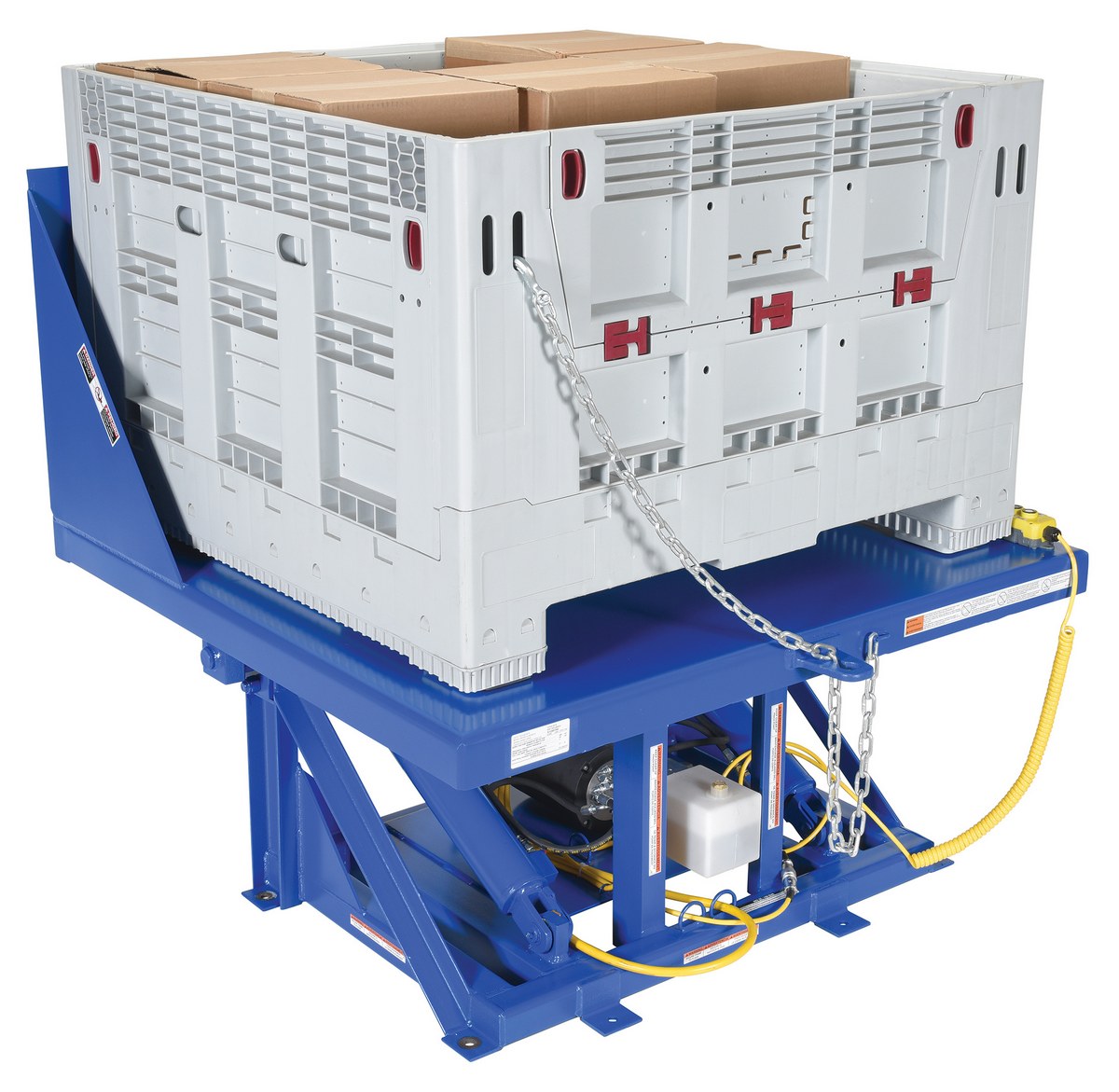 Steel Efficiency Master Tilt Table 90 Degree Tilt 48 In. x 48 In. 6000 Lb. Capacity BlueThe efficiency master tilt table tilts pallets, crates, boxes, or baskets to facilitate easy container loading or unloading. The table features all welded steel construction for years of durability. The unique design minimizes pinch points to meet OSHA requirements. It's ideal for upending products in shipping and receiving operations. The unit is equipped with an industrial quality motor that delivers the best torque with minimal amperage draw for maximum life. Standard voltage is 460/3PH with additional voltage options available. The tilt table has a standard push button hand control with a double acting cylinder for controlled tilt and return. The unit must be lagged to the floor.