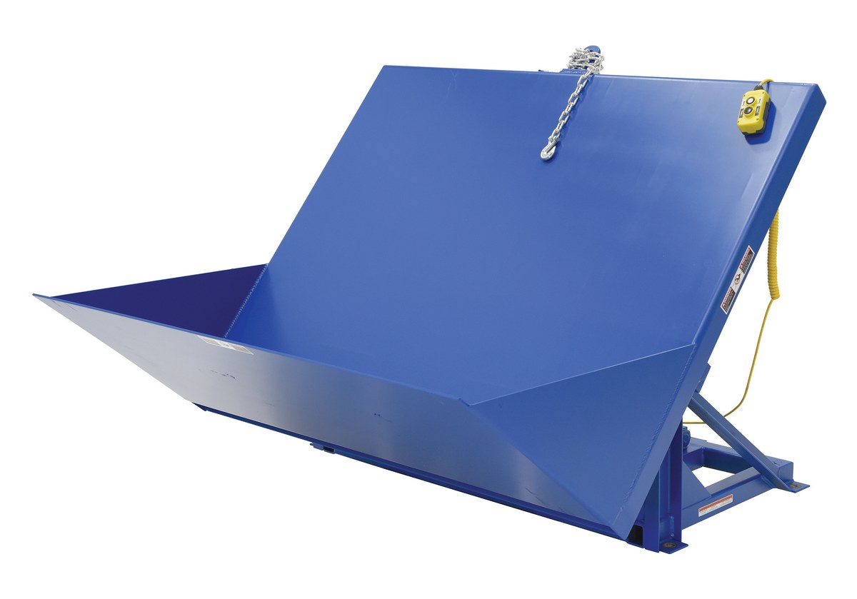 Steel Efficiency Master Tilt Table 90 Degree Tilt 60 In. x 50 In. 6000 Lb. Capacity BlueThe efficiency master tilt table tilts pallets, crates, boxes, or baskets to facilitate easy container loading or unloading. The table features all welded steel construction for years of durability. The unique design minimizes pinch points to meet OSHA requirements. It's ideal for upending products in shipping and receiving operations. The unit is equipped with an industrial quality motor that delivers the best torque with minimal amperage draw for maximum life. Standard voltage is 460/3PH with additional voltage options available. The tilt table has a standard push button hand control with a double acting cylinder for controlled tilt and return. The unit must be lagged to the floor.