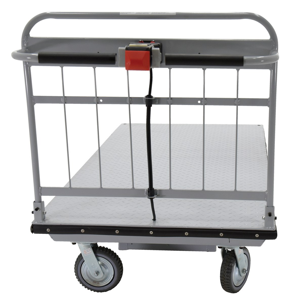 Steel Electric Material Handling Cart No Sides 36 In. x 72 In. 2000 Lb. Capacity GrayElectric material handling carts are ideal for moving heavy loads safely and easily throughout warehouses, offices, schools, and hospitals and incorporates a multitude of features to make light work of heavy loads. Reduce injury and increase productivity with these high quality carts. Features an 800W electric drive motor with (2) two 12V batteries for power and on-board 115V AC battery charger. The handle includes forward and reverse throttle control levers, an emergency reverse switch, a battery level gauge, and a slow/fast speed switch. Pinpoint turning is accurate with the mid-axle drive feature.