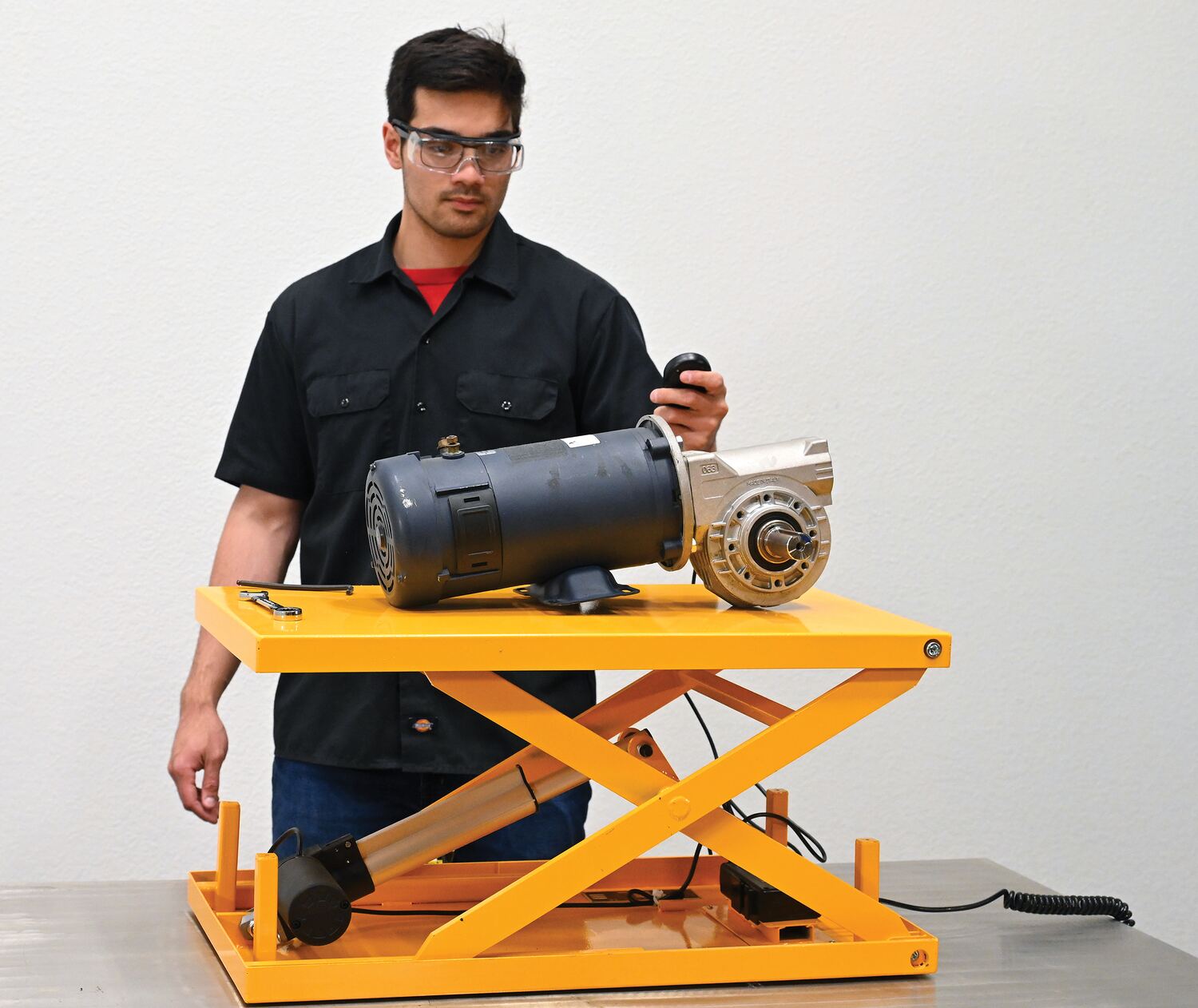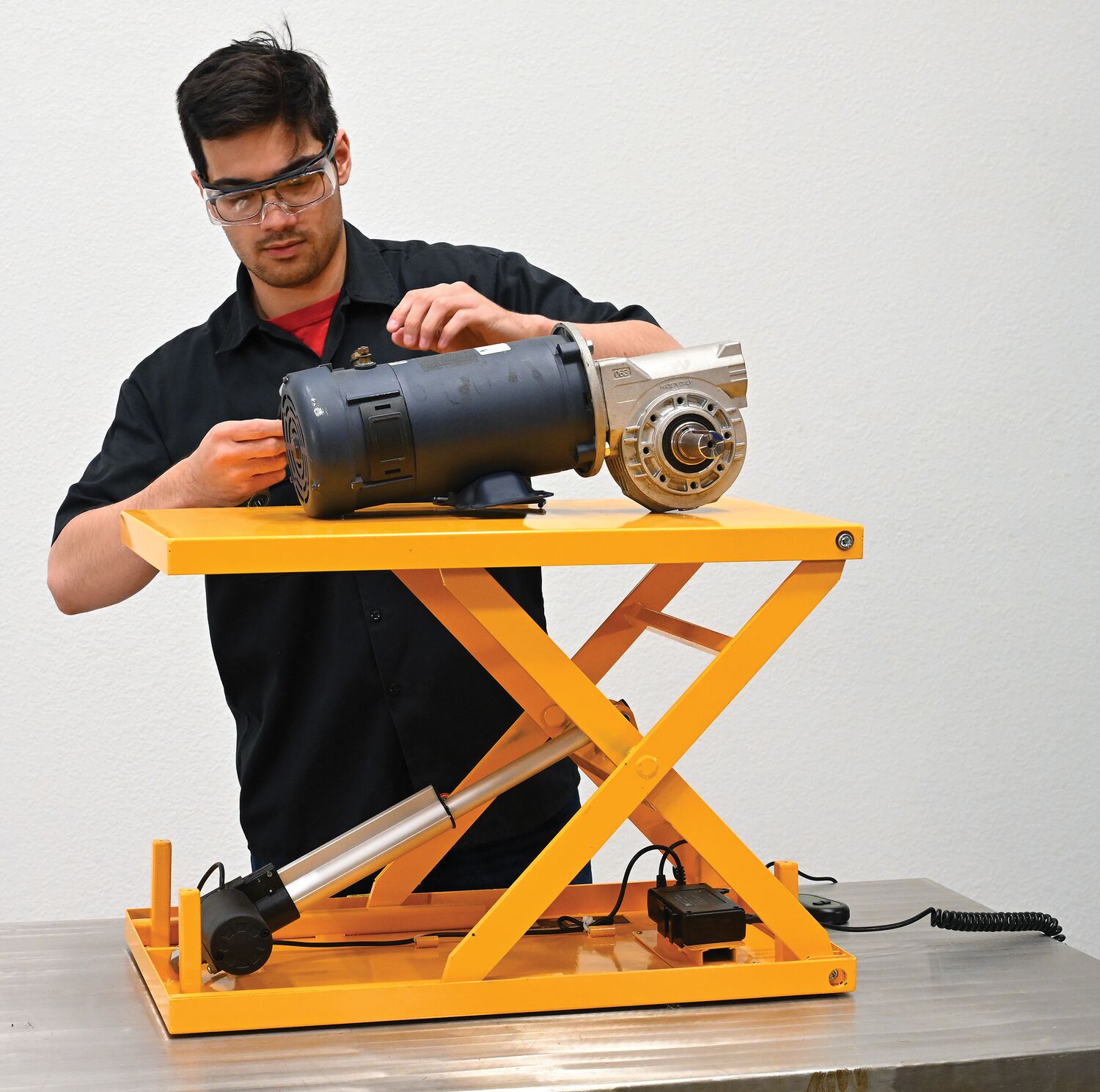 Steel Electric Linear Actuated Scissor Lift Table 27-3/4 In. x 15-3/4 In. x 15 In. 200 Lb. Capacity YellowWith user well-being always at the forefront of everyone's mind, the linear actuated lift table provides an ergonomically friendly option in an otherwise UN-ergonomic world. Due to its small size and lightweight structure the lift table works well when placed directly onto existing work benches or tables. This addition allows the user to work on small, heavy objects, at precise heights. The linear actuator not only plays an integral role in raising and lowering the table top quickly and efficiently. But, it also minimizes any platform drift, which is a common occurrence with standard hydraulic carts and tables. The unique open sided table design lets the user load and unload products without obstruction or hindrance.
