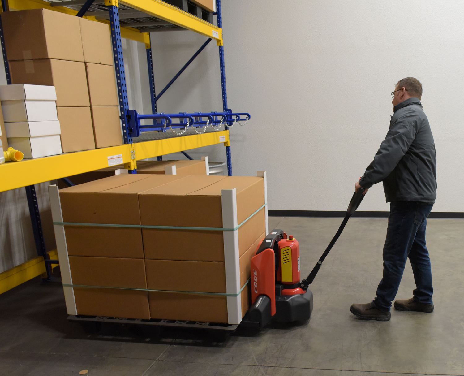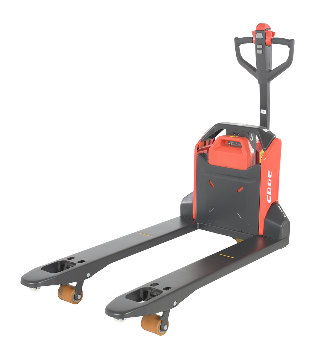 The electric pallet truck is the perfect change from the manual design. This construction design is built to last, withstand rugged daily use, and diminish manual labor. Multi-function capabilities like the raise lower buttons and emergency brake are located in the handle. All areas are easily accessible for general upkeep and cleaning. Truck can be used with the handle in the upright position for utilization in the small areas. Horn is also included.