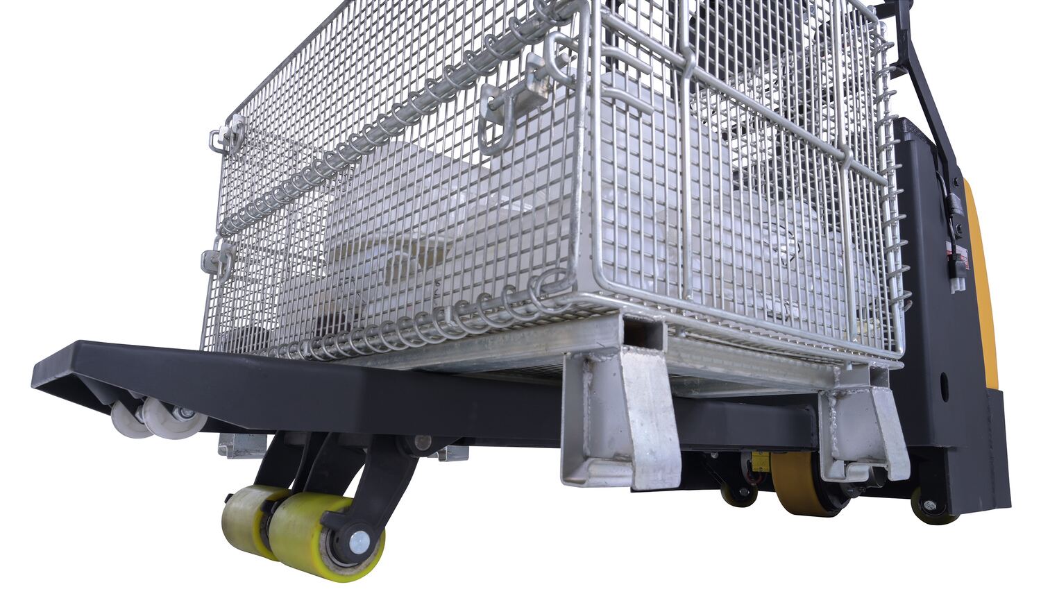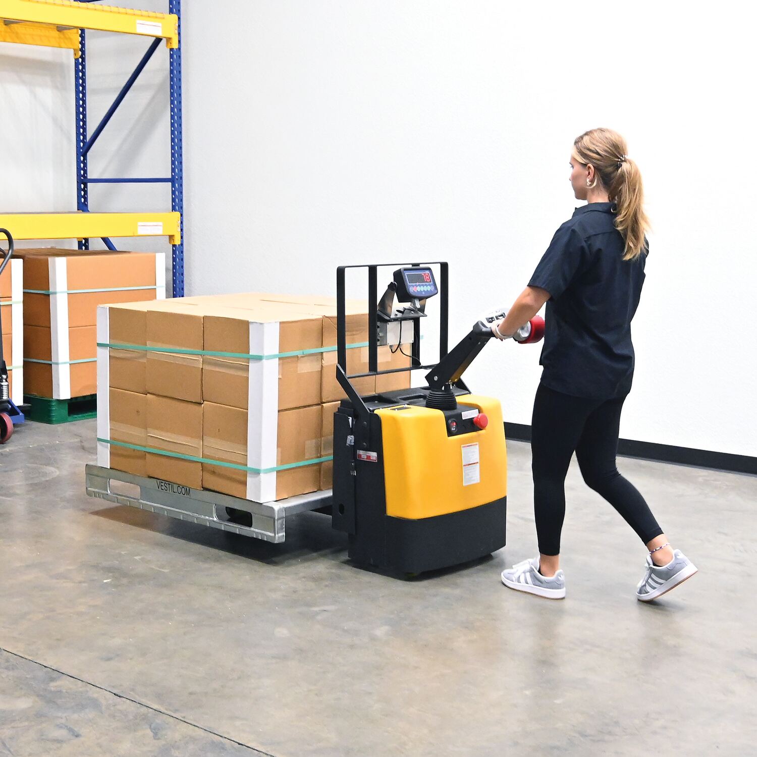 Steel Electric Pallet Truck Single Fork 40 In. Length With Scale 2,600 Lb. Capacity BlackThere are jobs where a standard electric pallet truck will suffice, but sometimes the job requires something unique. With the single fork electric pallet truck that requirement is fulfilled. The one fork design enables users to pick up and transfer items with a single fork pocket that would previously be difficult to maneuver such as half size pallets or bulk containers. With a walk behind set-up, the controls are organized in an accessible central location on or near the driving handle. This unit is battery operated for consistent steady use. (2) 12V AGM batteries standard. Powder-coated finish for baked in added toughness.