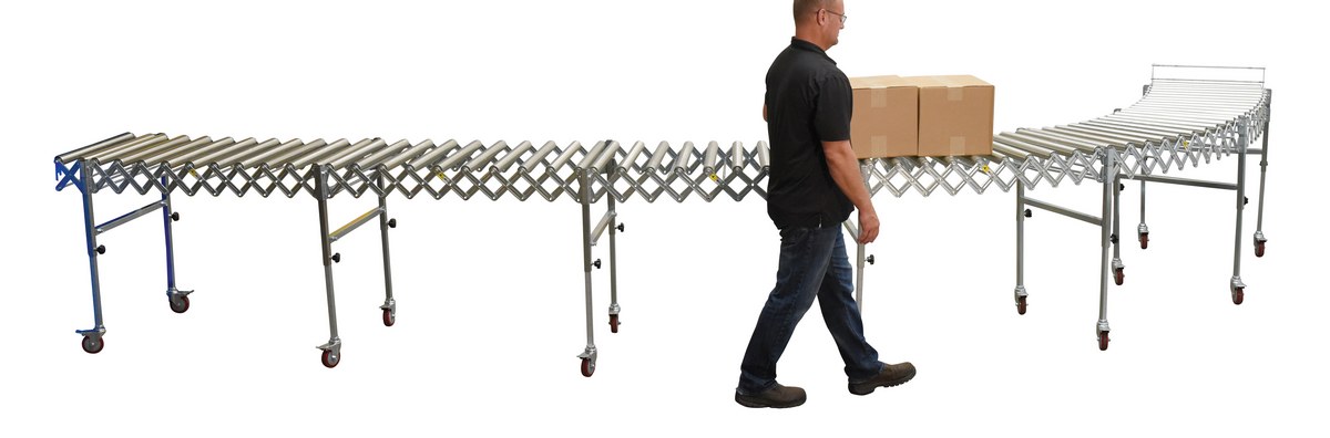 Expandable roller conveyor is the perfect asset for packaging and distributing facilities. The conveyor provides the user an ergonomically friendly way to transfer goods while minimizing the bending and twisting during shipping and handling. A strong construction provides strength for transferring large awkward products. The conveyor can be expanded to reach greater distances between packaging points. Once finished it can be retracted to fit in a condensed area.