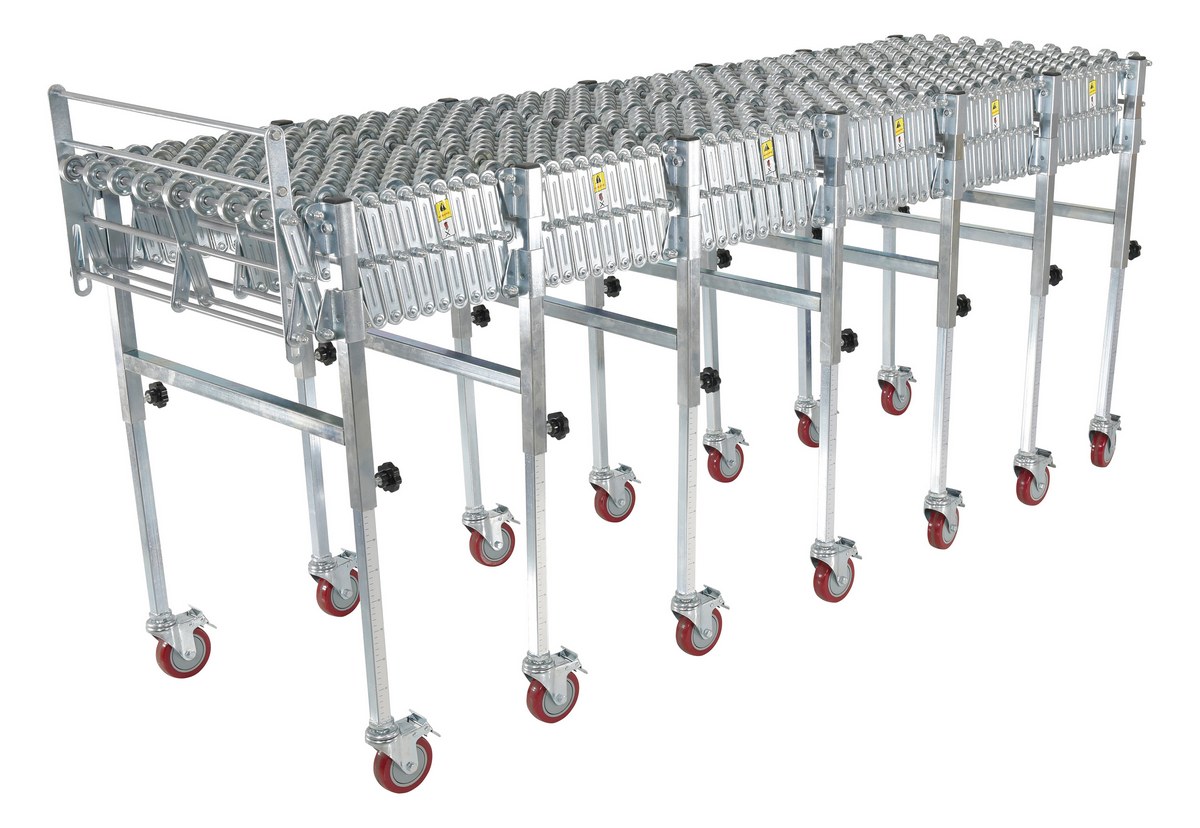 Expandable roller conveyor is the perfect asset for packaging and distributing facilities. The conveyor provides the user an ergonomically friendly way to transfer goods while minimizing the bending and twisting during shipping and handling. A strong construction provides strength for transferring large awkward products. The conveyor can be expanded to reach greater distances between packaging points. Once finished it can be retracted to fit in a condensed area.