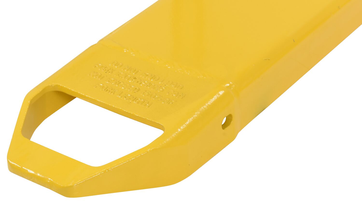 Steel Fork Extensions 6 In. x 72 In. 4,000 Lb. Capacity YellowProvide the extra support needed to lift long or large objects with a fork truck using a pair of fork extensions. Welded steel construction with cast steel tips. Steel retaining strap prevents fork extensions from sliding off forks during use. Powder coat yellow finish. OSHA regulations require that extensions are no more than one-hundred and fifty (150) percent of the existing fork length. Insert loop at the tip of the fork and slide it up at a forty-five (45) degree angle. Then, lay it down over the existing fork. To be used with class 2 and class 3 forks only.