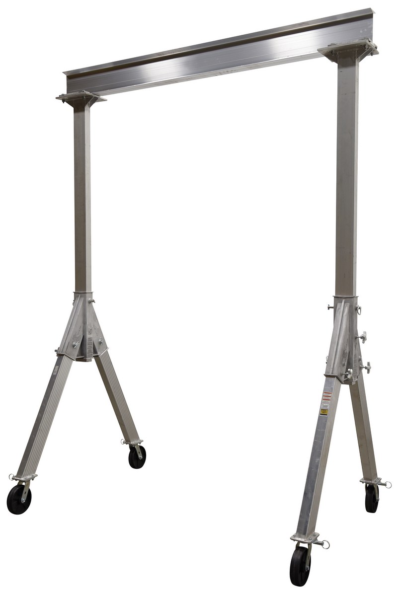 Aluminum Fixed Gantry Crane with Glass Filled Nylon Locking Casters 8 Ft. x 10 Ft. 2000 Lb. Capacity SilverThe fixed height Aluminum Gantry cranes are ideal for the manufacturing and maintenance facilities. The aluminum construction is easily manageable and can be simply assembled for immediate use. The unit has a fixed height for working in a permanent or semi-permanent environment. The casters allow the user to move the crane from workstation to workstation and smoothly roll over rough surfaces, while not marring. Do not move units while loaded.