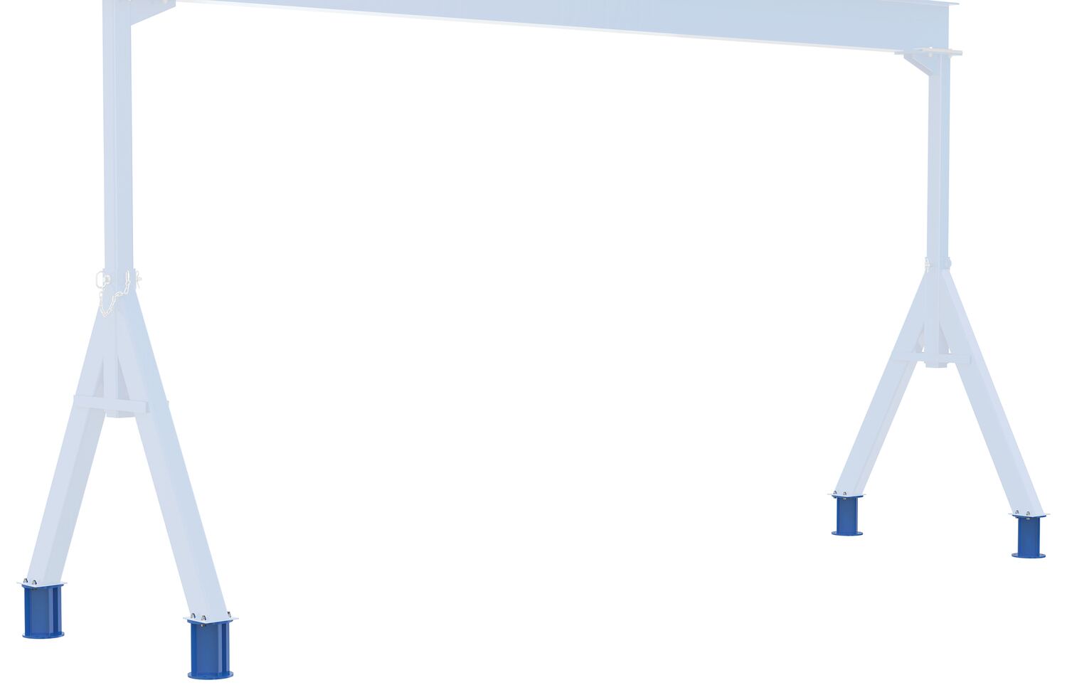 Stationary leg sets are a great accessory to a gantry crane. By assigning the crane in a specific area the legs set create a solid base to a workplace. The set continues to have all the strength and durability of its portable counterpart, except the ability to roll. Field installed.