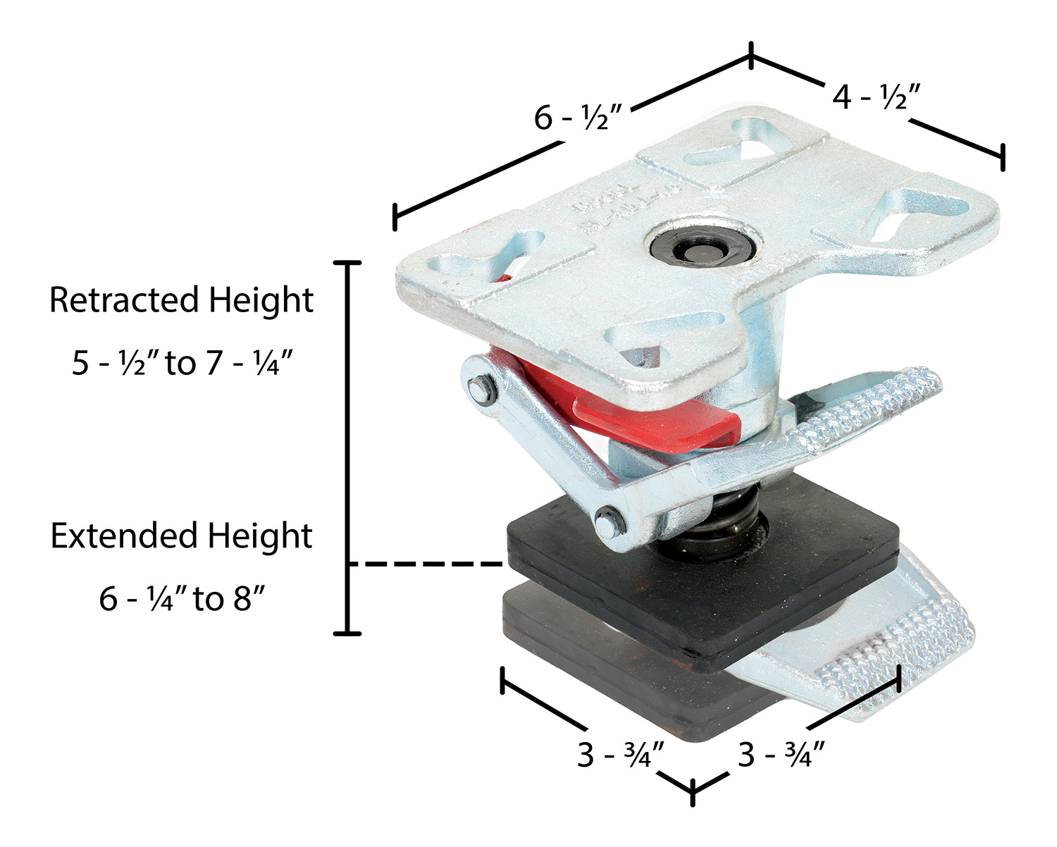| Used with Caster Size (in. - in.): 4 to 6 | Extended Height (in. to in.): 6-1/4 to 8 | Retracted Height (in. to in.): 5-1/2 to 7-1/4 |