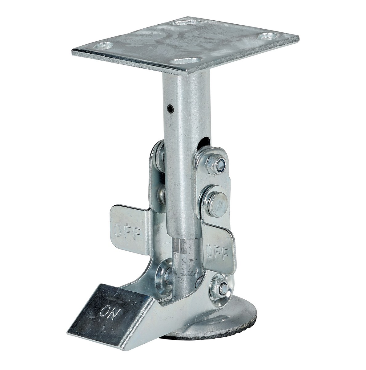 Floor locks may be used on platform trucks, fixture dollies, or equipment with casters. Simple foot pressure immobilizes equipment. Locks when large friction face is pressed against the floor. To release simply kick release rod. Brake is independent of casters and can be installed to any convenient location on the cart. Vertical mounting plate designed to mount to sides of carts and other portable products. The spring loaded pad accommodates uneven floors. Units mount with pad 1." off the floor when retracted.