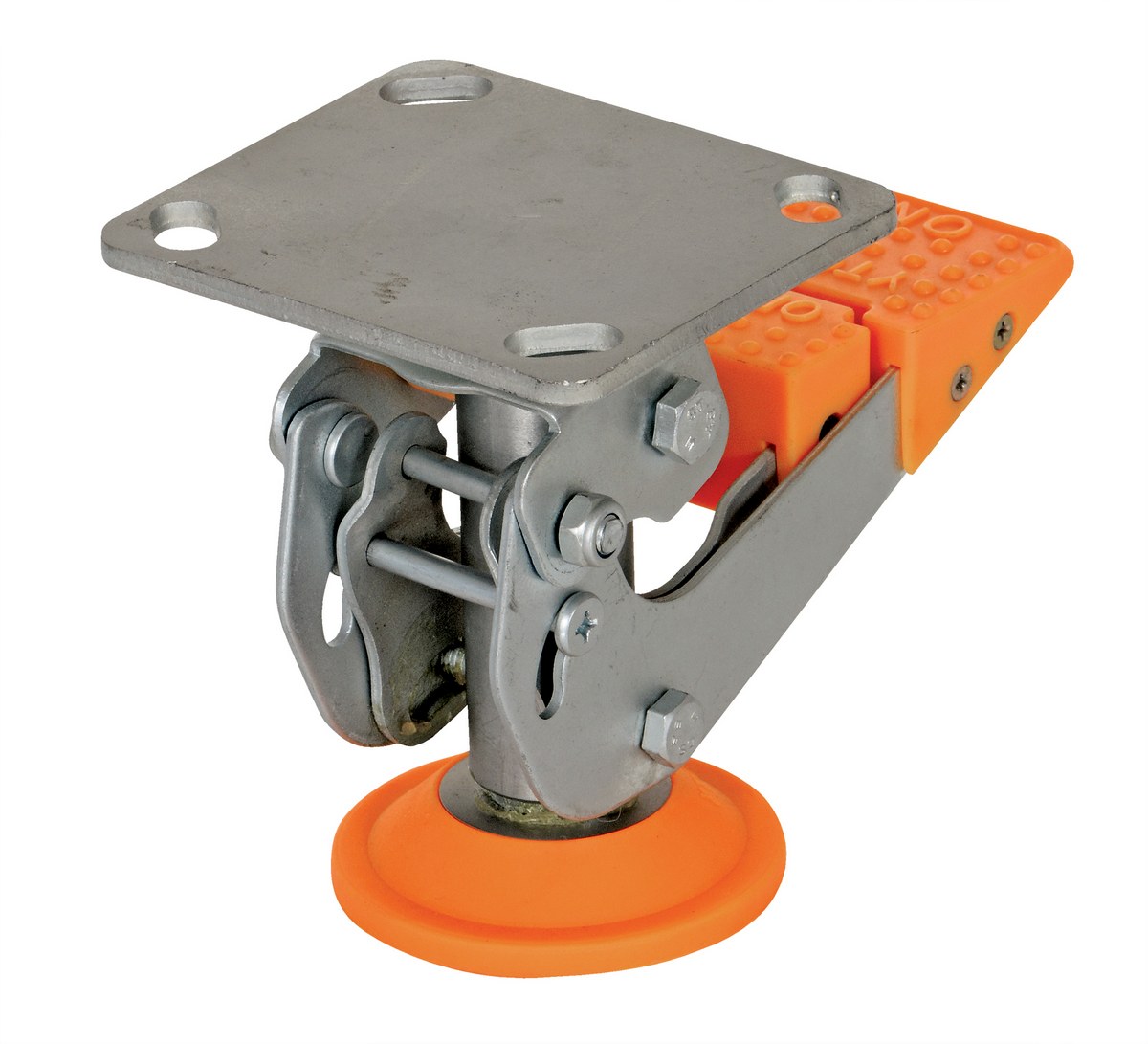 Floor locks are ideal for maintenance and construction facilities. The unit is designed to created a stable environment, while decreasing the chance of jostling or slight movement. The unit is constructed of steel with a thermoplastic polyurethane base. To use, place the unit close to a desired wheel or caster and raise until tension is built. Once secured, a simple locking device can be activated by applying pressure to the foot pedal.