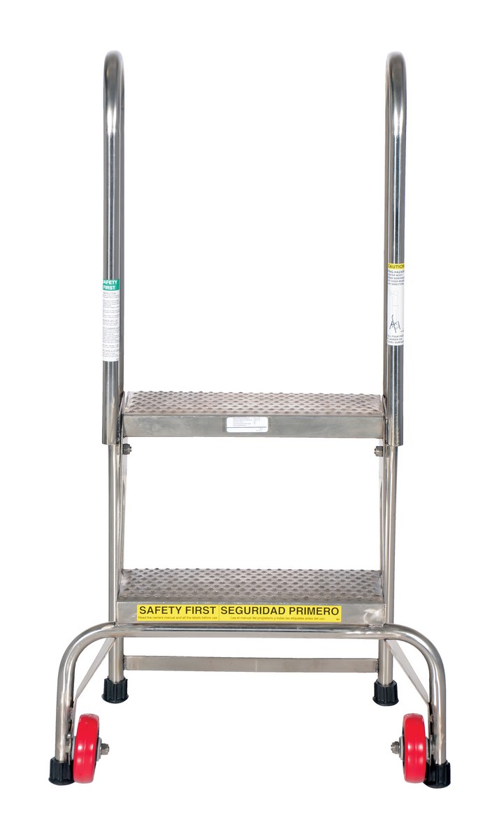 Stainless Steel Folding Ladder with Wheels 2 Step 350 Lb. Capacity BlueThe folding ladder with wheels has a locking foldable design that saves on storage space when ladder is not in use. Ladder folds after unlocking spring-loaded detent pin. Once unit is folded, tilt back on wheels for easy portability. Ladder is carbon steel. The steps are perforated to provide a non-slip surface.