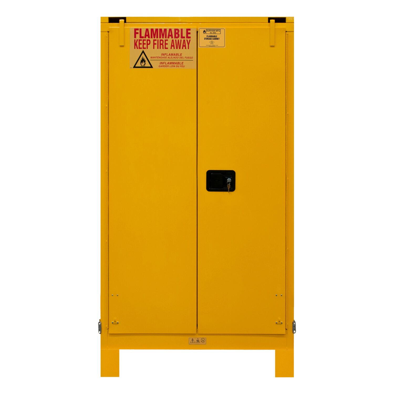 Flammable Self Closing Storage Cabinet With 6 Inch Legs 60 Gallon Capacity YellowKeeping dangerous items safe is always a priority. Built to help with that safety is the flammable storage cabinet. A fully welded, double wall steel construction has the durability and strength that many standard cabinets just don’t have. One of the best examples of the tremendous care that goes into each and every cabinet is the grounding aid. Each cabinet is equipped with an electrical ground to eliminate any electrostatic discharge. Another often over looked feature is the two inch leak proof base. This base neatly corrals any material or substances that may have escaped their original containers. Each cabinet comes assembled and prepared to keep you and your workplace safe!