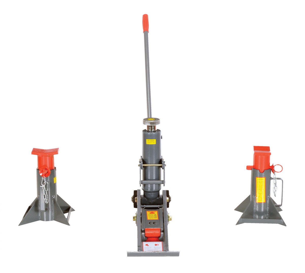The manual Hydraulic Fork Truck jack is designed to raise fork trucks for maintenance. Features high-quality seals, chrome plated internal components, and rugged steel construction. This jack is manually raised by a hand pump lever and the lift height provides room needed to perform a variety of repairs. The removable handle and the compact size make it easy to maneuver and transport. Includes two (2) jack stands with holding pins for adjustable heights.