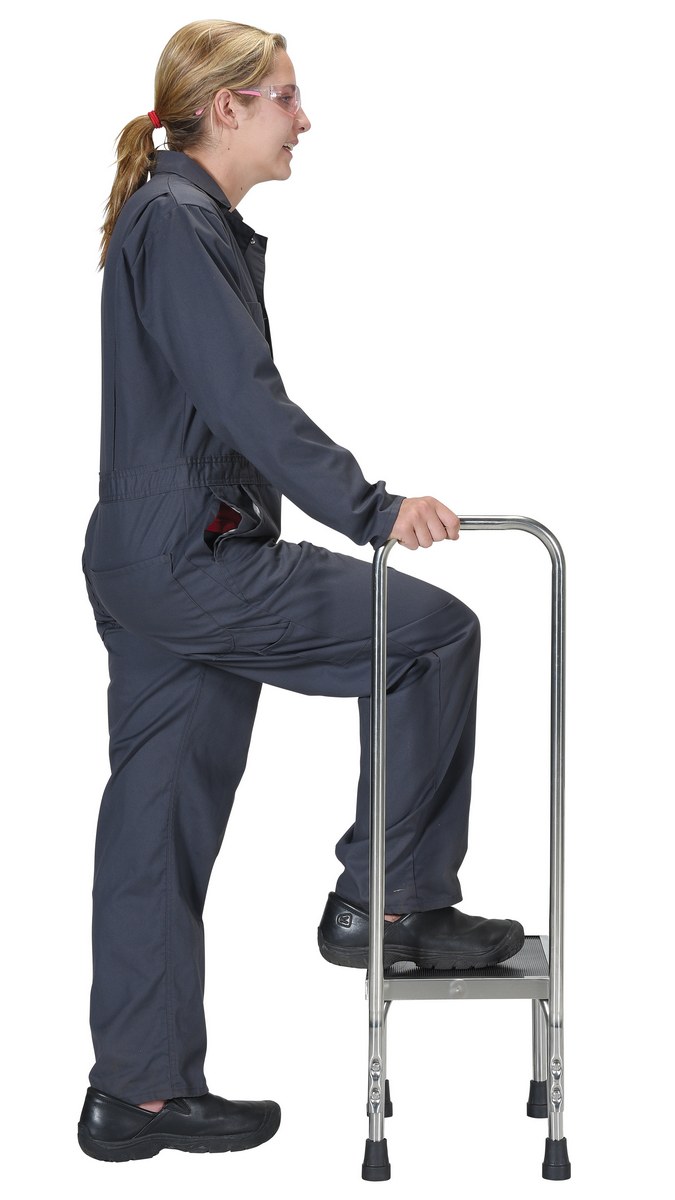 The optional handle for the stainless steel step stands. The handrail promotes steadiness and sure footing when reaching products.