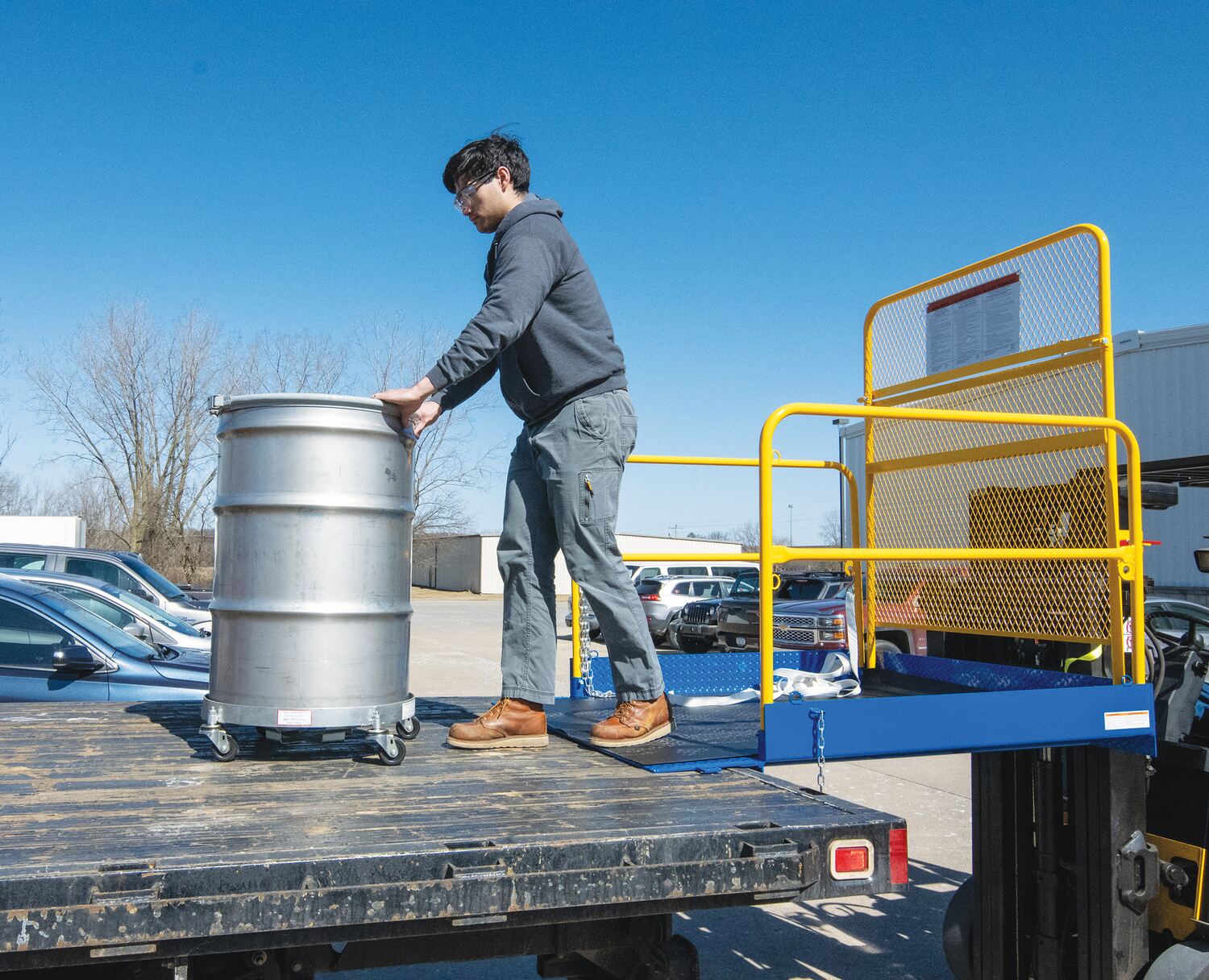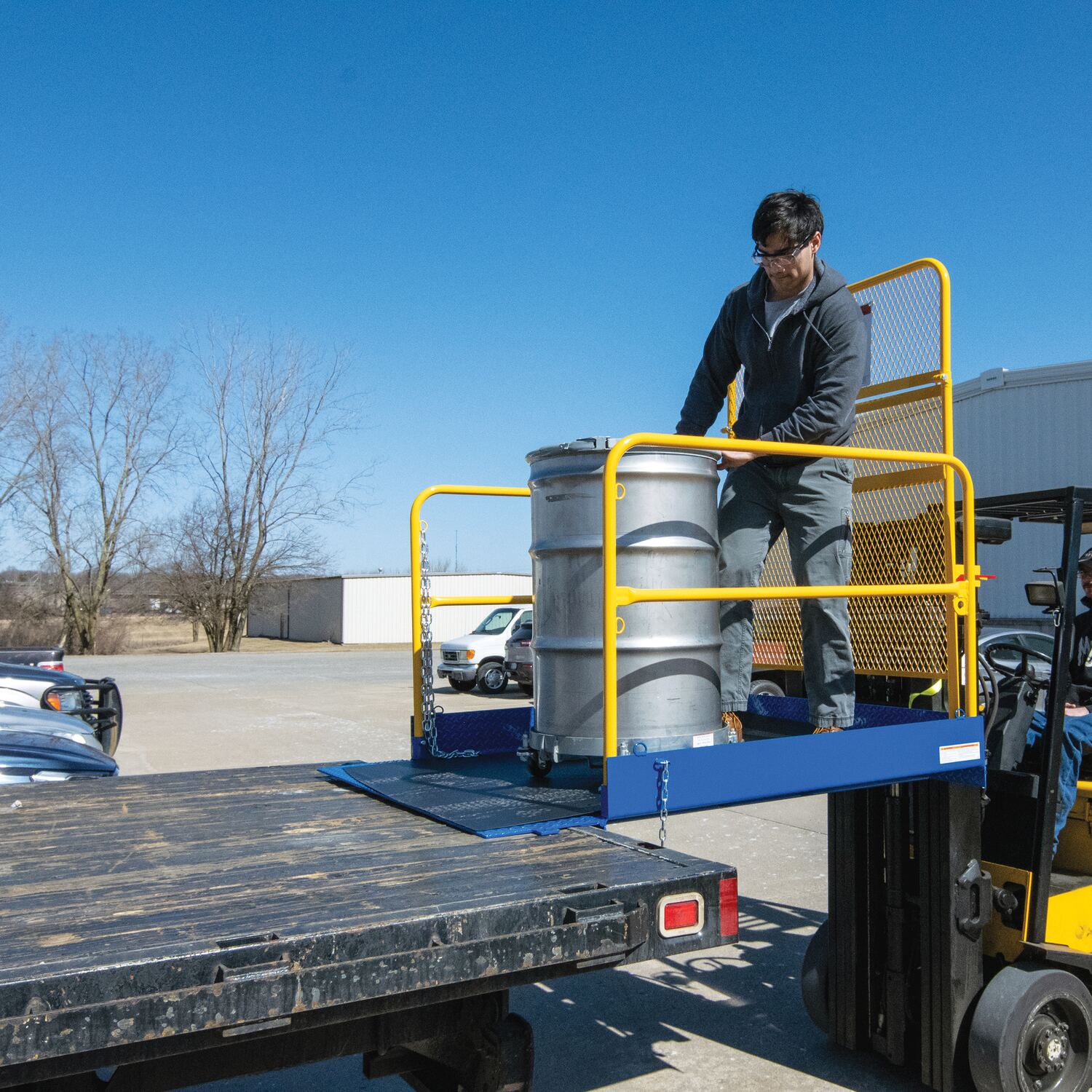 Steel Economical Portable Loading Platform with Handrails 54 In. x 54 In. 2000 Lb. Capacity BlueThis loading platform for fork trucks allows fork trucks to load/unload items into trucks and trailers. Maximum uniform weight capacity is dependent on fork truck capacity. Includes fold-down lip to help with transition. Side guard toe boards. Four (4) tie-down rings are included for securing equipment (tie downs not included). Diamond tread plate floor for extra traction. Handrails on two (2) sides, back mesh screen and chain to secure open end. safety strap (included) to secure platform to fork truck. Steel construction with blue baked-in powder-coated toughness.