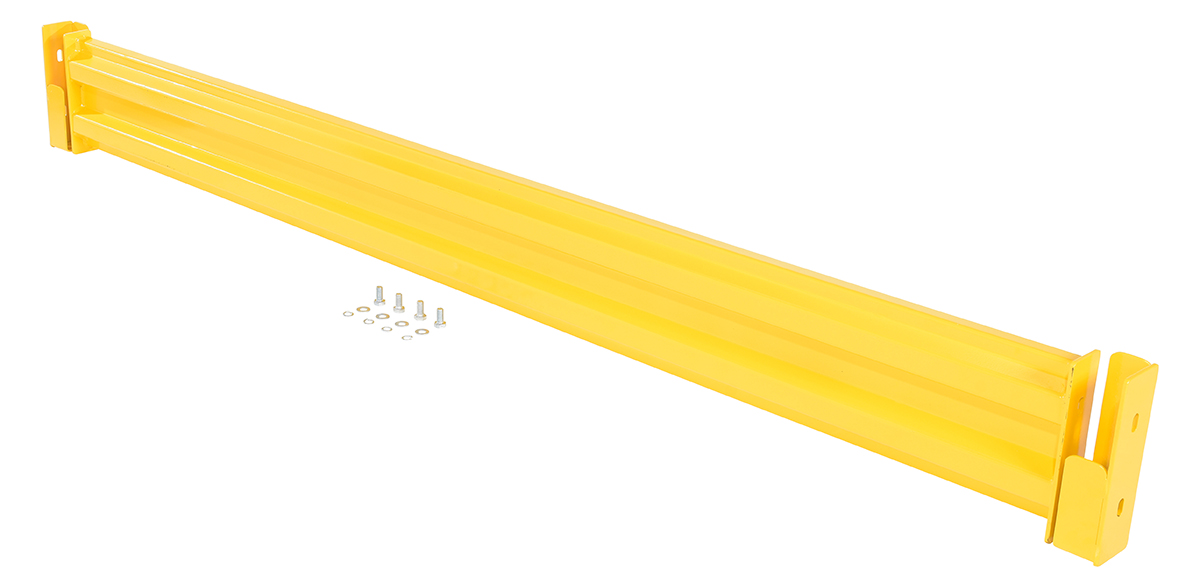 Steel 2 Ribbed Drop In Style Guard Rail 90 In. Length YellowProtecting equipment, inventory, and most importantly individuals from damage or injury is always a concern. But, with a structurally strong steel guard rail those worries can be eased. This rail is double ribbed for impact resistance both indoors and out. With the drop-in style rail design, accessibility is simple and rails can be positioned quickly. To put in place simply slide the rail sections into the post saddles. Powder coated finish for built in added toughness. Additional posts are available and sold separately. If adding a rail to an existing rail and post section, only a single post is needed.