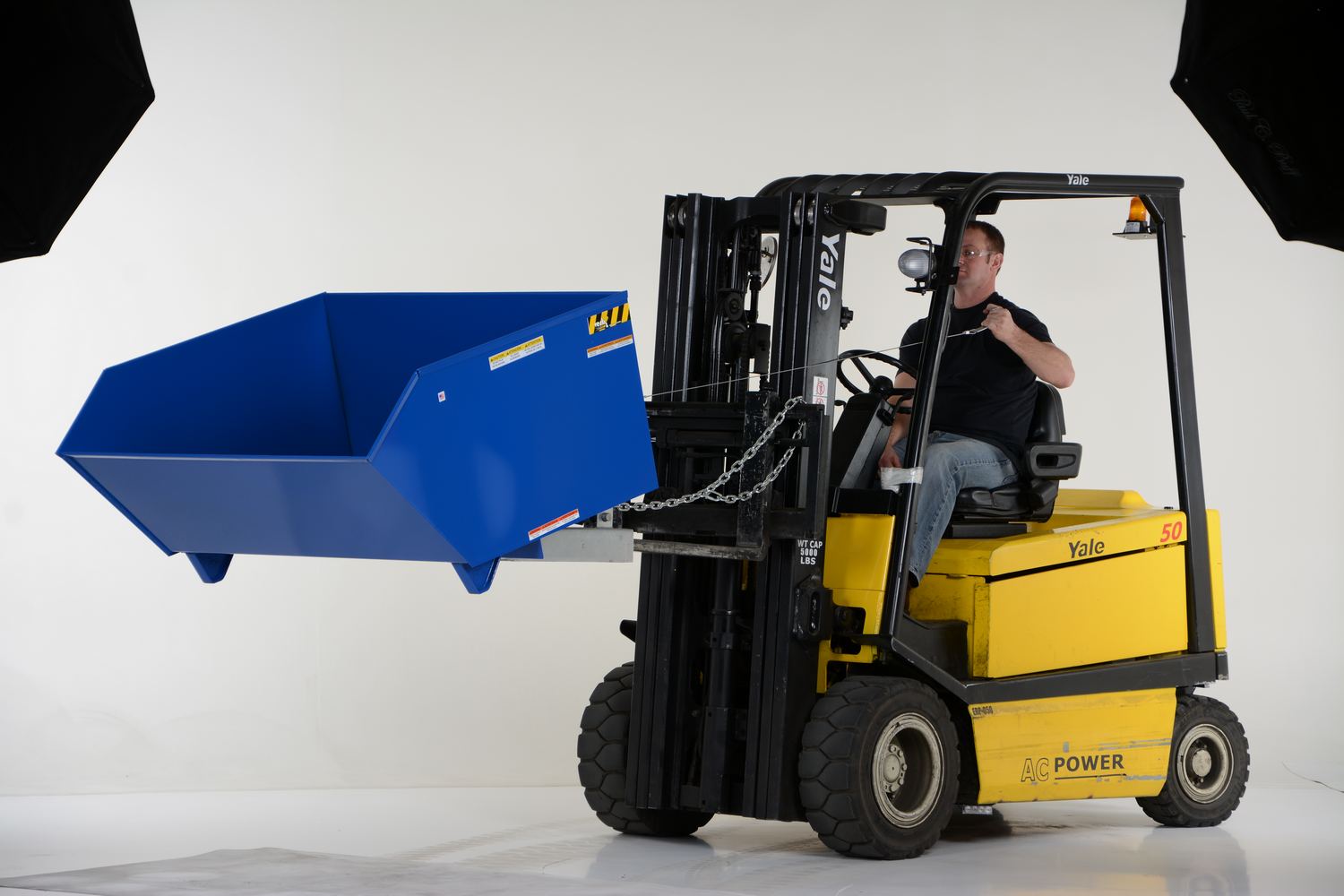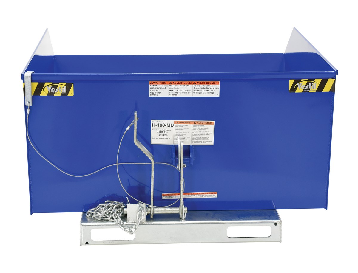 Steel Medium Duty Low Profile Self Dumping Hopper 1 Cubic Yard 4000 Lb. Capacity BlueThe Medium Duty Low Profile 90 degree self-dumping steel Hopper feature a full ninety (90) degree dump angle with a cushioned rubber bumper stop. The low profile design is essential for convenient loading. Dumping with a fork truck is quick and simple. A cable is pulled from the seat of the fork truck to dump the hopper. The unit returns to an upright and locked position when lowered to the ground. Fork pockets are 22" long and are capped on the end to allow for 90 degrees dump. The included safety restraint/chain must be securely attached to the lift truck carriage without slack. Models with same overall width may be stacked. For example, models H-25 may be stacked with H-50’s, the H-100’s can be stacked with H-150’s, while the H-200 hoppers can only be stacked with other H-200 series models. Never stack hoppers more than 3 high.