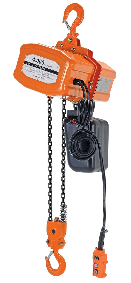 Steel Economy Chain Hoist with Chain Container 3 Phase 4000 Lb. Capacity OrangeThis compact economy Chain Hoist with chain container features a high efficiency motor with convenient push-button operation and three phase power. This hoist is dust and water resistant, load limit fitted, and features a 4:1 safety factor. Chain container included.
