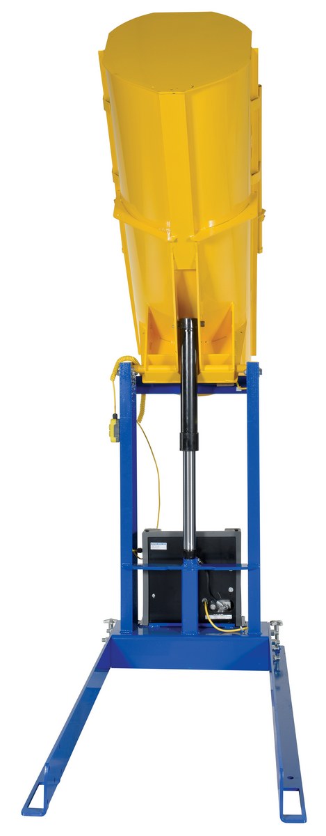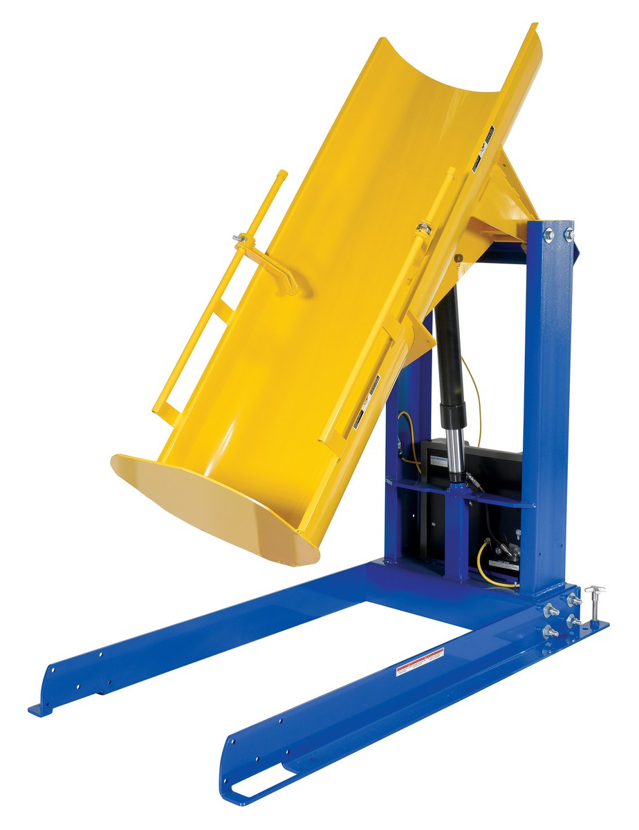 Steel Stationary Hydraulic Drum Dumper 48 In. Dump Height 750 Lb. Capacity Blue / YellowThe Hydraulic drum dumper is what you need to dump heavy drums. Works with plastic, steel, and fiber drums. Dumper has a solid steel chute and all steel construction. Upper travel limit switch, emergency brass safety velocity fuse in cylinder, and vertical adjustment drum restraints are standard. Dumper is operated with a hand held control on a coil cord standard.