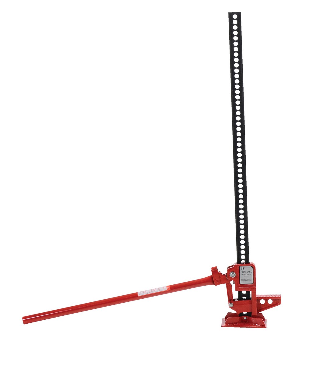 Cast Iron Heavy Duty Ratchet Farm Jack 42 In. Raised Height 7,000 Lb. Capacity RedDesigned to lift, pull and push. This jack is the perfect accessory for moving heavy machinery and heavy objects. Great for around the farm or landscaping during post, poles or tree stump removal. No hydraulics to leak or become damaged.