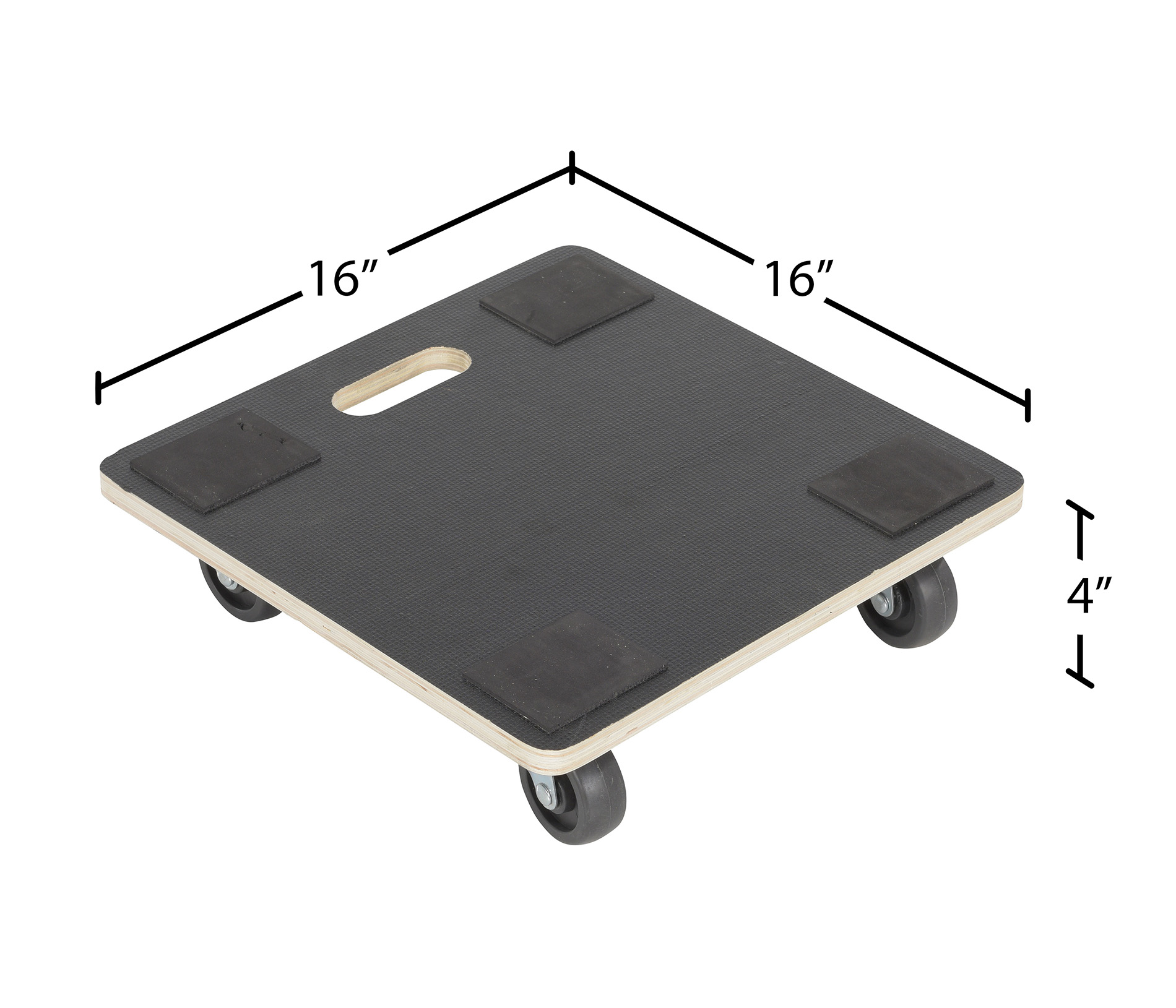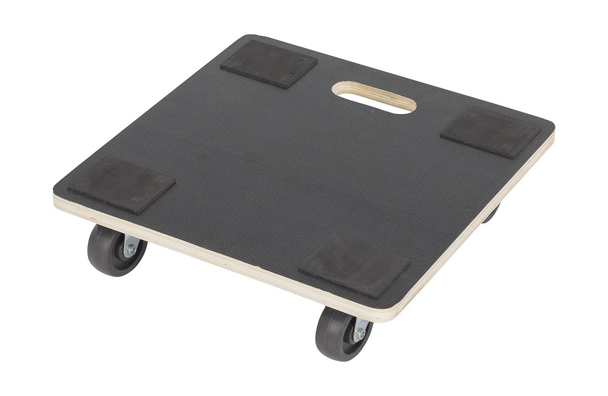Hardwood Square Dolly Deck 16 In. x 16 In. x 4 In. 400 Lb. Capacity BlackThe Hardwood dolly is ideal for the distributing and shipping facilities. The unit is designed to transports boxes, crates, or supplies from workstation to workstation. The dolly can be modified by placing a pull strap for ergonomically friendly use.