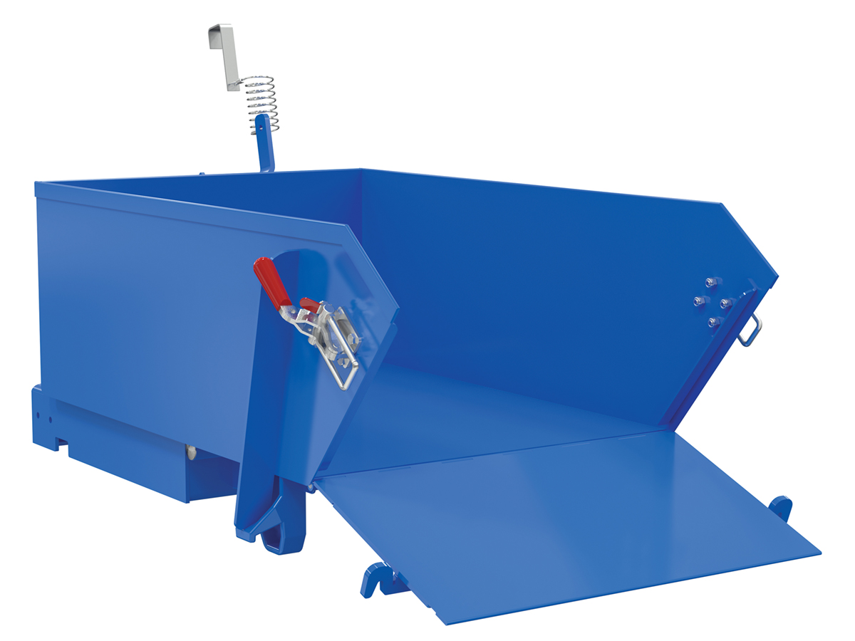 Steel Light Duty Self Dumping Hopper with Fold Down Front 1/4 Cubic Yard 2000 Lb. Capacity BlueThis self-dumping steel Hopper has a low-profile design with a drop-down front for easy shovel loading. The manual hand latches are used to secure the drop-down front. The manual pull-cable is used to dump the hopper from the seat of a fork truck, the dumper returns to the upright position when lowered to the ground.