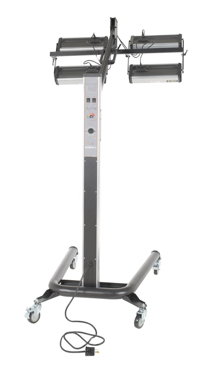 Steel Infrared Heater 4 Panel 230 Volt 1 Phase Black/SilverAn infrared heater provides beneficial warmth to a variety of industrial areas. A simple to use control panel allows the function and heat settings to be utilized in the best possible way for maximum efficiency. An adjustable heater arm gives the user the ability to maneuver the heating elements into a position that best fits the type of surface that is being heated. Unit includes casters to easily maneuver the unit to and around the work area. A robust structural construction endures work place conditions that are continually changing.