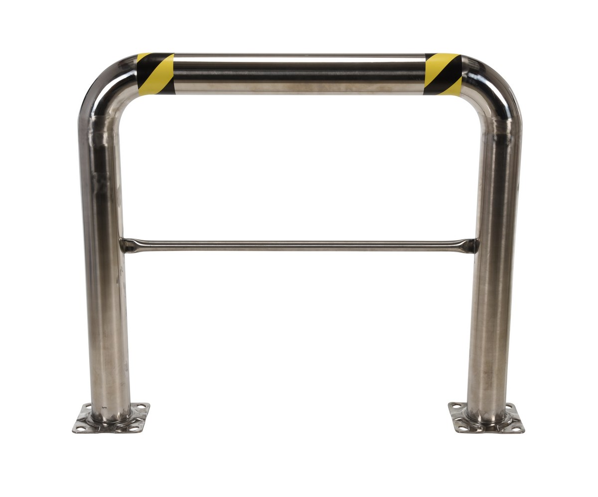 This High Profile machinery guard is heavy-duty welded steel construction for protecting racks, building walls, expensive equipment, and hundreds of other applications. Unit includes a mid-rail to comply with OSHA requirements. Stainless steel polished finish. Two (2) base plates with four (4) pre-drilled mounting holes in each plate.