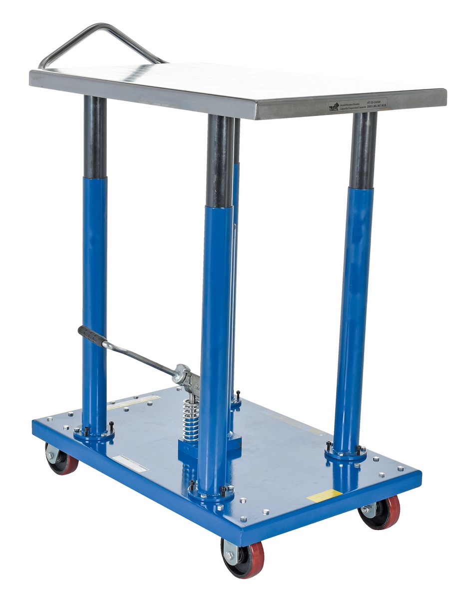 Steel Hydraulic Post Table 24 In. x 36 In. 2000 Lb. Capacity BlueThe Hydraulic post table is built for heavy-duty shop use. This post table is good for many material handling uses including: lifting dies and castings, moving machine parts, positioning welders work, leveling feed material for pump presses, conveyors and press brakes, and similar material handling jobs. The posts are telescoping to help stabilize and support loads during operation. Table includes four casters; two locking swivel with brakes and two rigid. The light duty-units feature a single-speed foot pump. All foot pumps include a down speed control valve for safe platform lowering.
