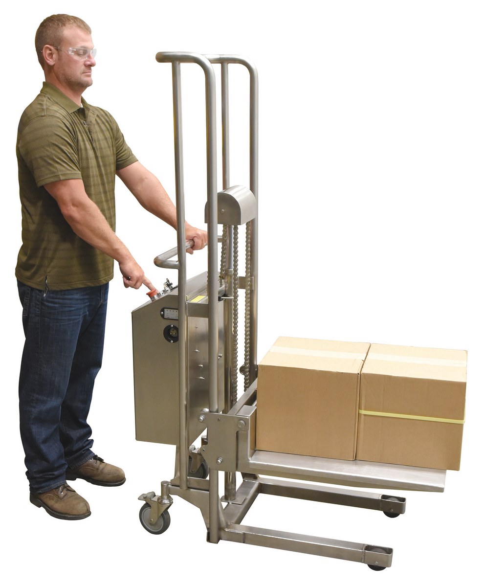 Partially Stainless Steel Portable DC Powered Hefti-Lift 44 In. x 68 In. 880 Lb. Capacity SilverThe Hefti-Lift is a user friendly, portable hydraulic lift. The lift provides reliable, power lifting when moving and positioning loads. It includes a removable platform for operation requiring forks. The non-slip chain is used for accurate positioning while the lift rolls easily on two rigid and two swivel poly-on-steel casters that includes a foot operated brake. The unit has an all welded construction with a chrome platform and uprights. Not for use with pallets.