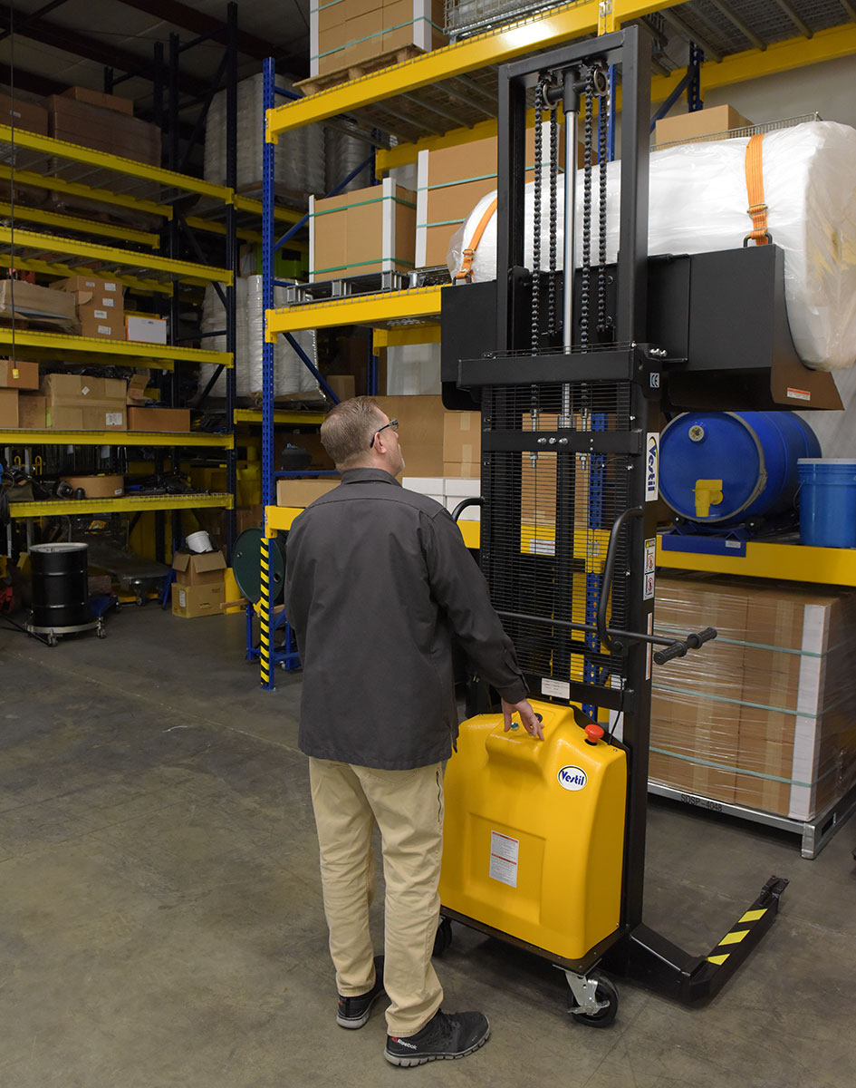 Awkwardly sized, heavy rolls have always been difficult to lift and maneuver by hand. But, with the hydraulic roll lifter all that lifting is made easy. Simply place the roll on the wide concave deck and secure in place. Once stabilized, there is a limited amount of movement during transit. The unit is DC powered and works effortlessly with a capacity of 600lbs. driving handles are in a position that allows the user to maintain a proper posture. Powder coated finish for added toughness. Four poly casters roll smoothly across a variety of surfaces.