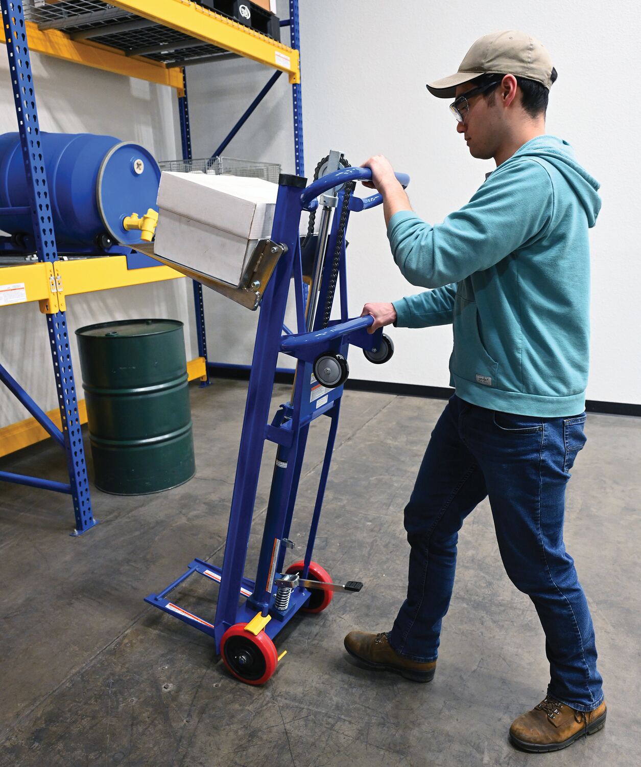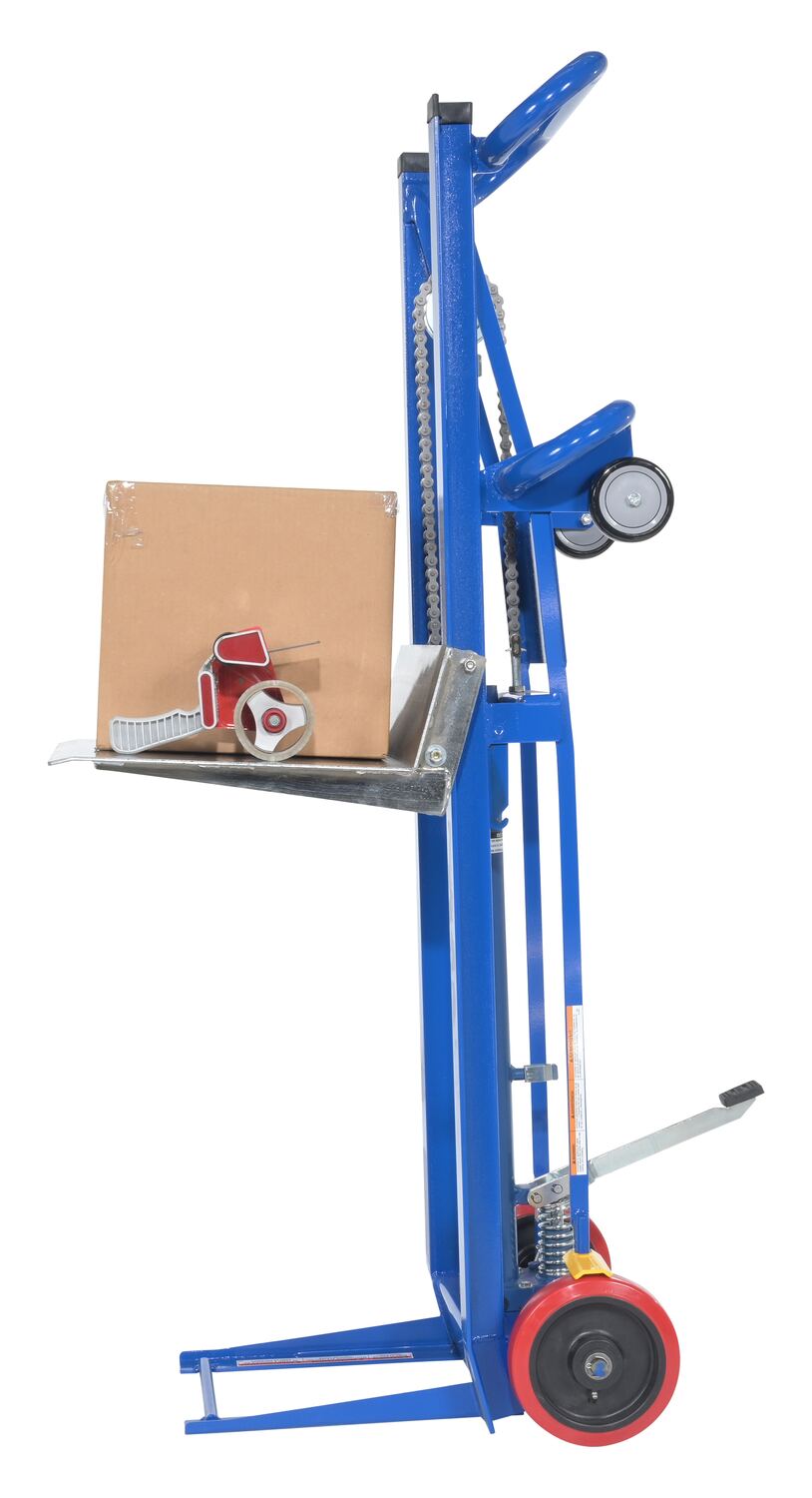 The hydra cart transports loads in the lowered position and maneuver work materials to an ergonomic height, which is ideal in compact work areas. It's safe and easy for one person handling of loads and an efficient way to unload heavy objects from semi-trailers. The rugged steel construction allows for many years of service. The dependable precision built hydraulic system is activated by an easy action foot lever. The additional rollers on the handle make loading into a delivery truck easy. A single wheel brake comes standard.
