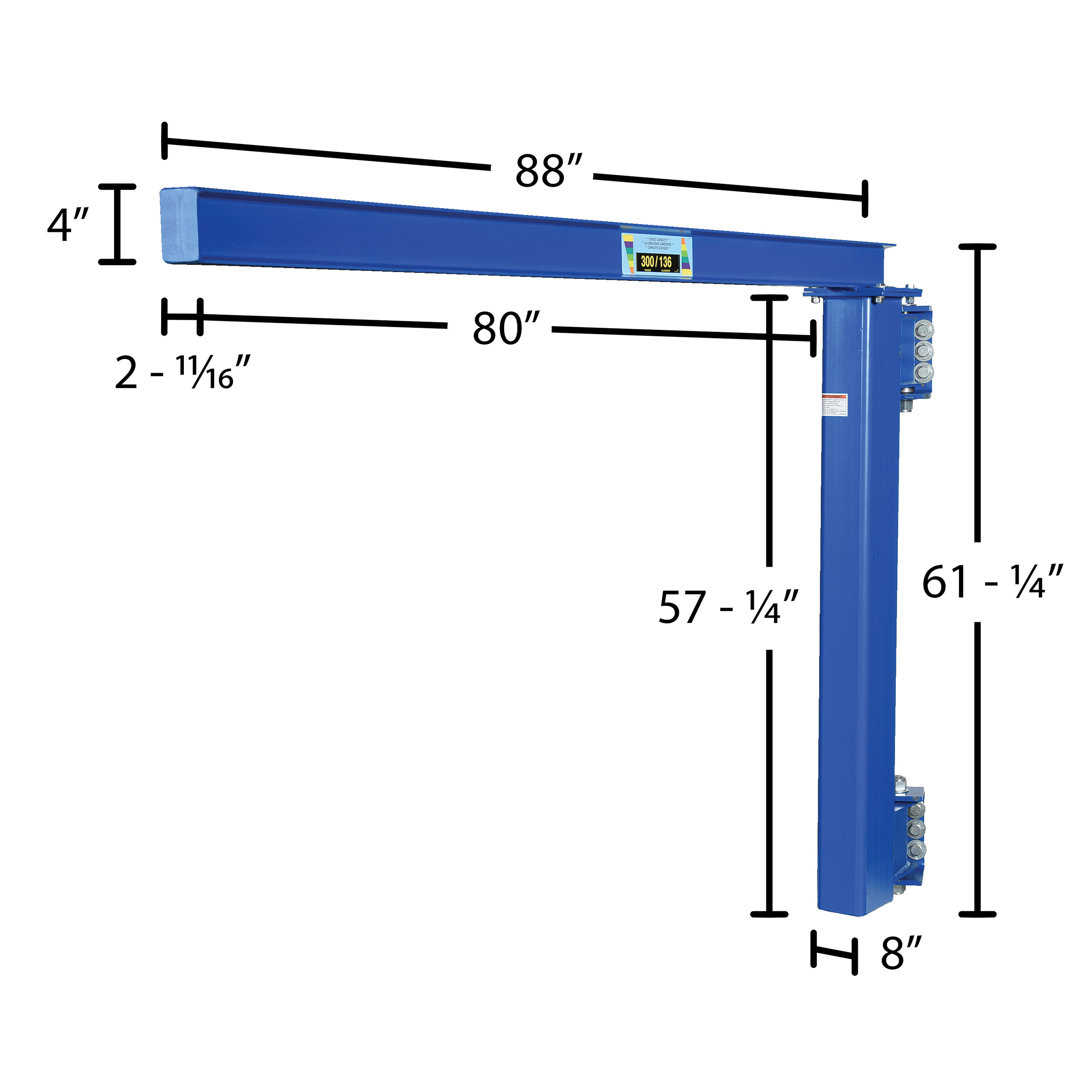 Steel Low Clearance Tie Rod Jib 80 In. I-Beam 300 Lb. Capacity BlueThis wall Jib is designed to assist workers in the maneuvering of materials as well as achieving maximum headroom where low ceilings are of concern. This cantilever style jib mounts to true vertical wall members. Increase personnel productivity by lifting awkward material capacities.