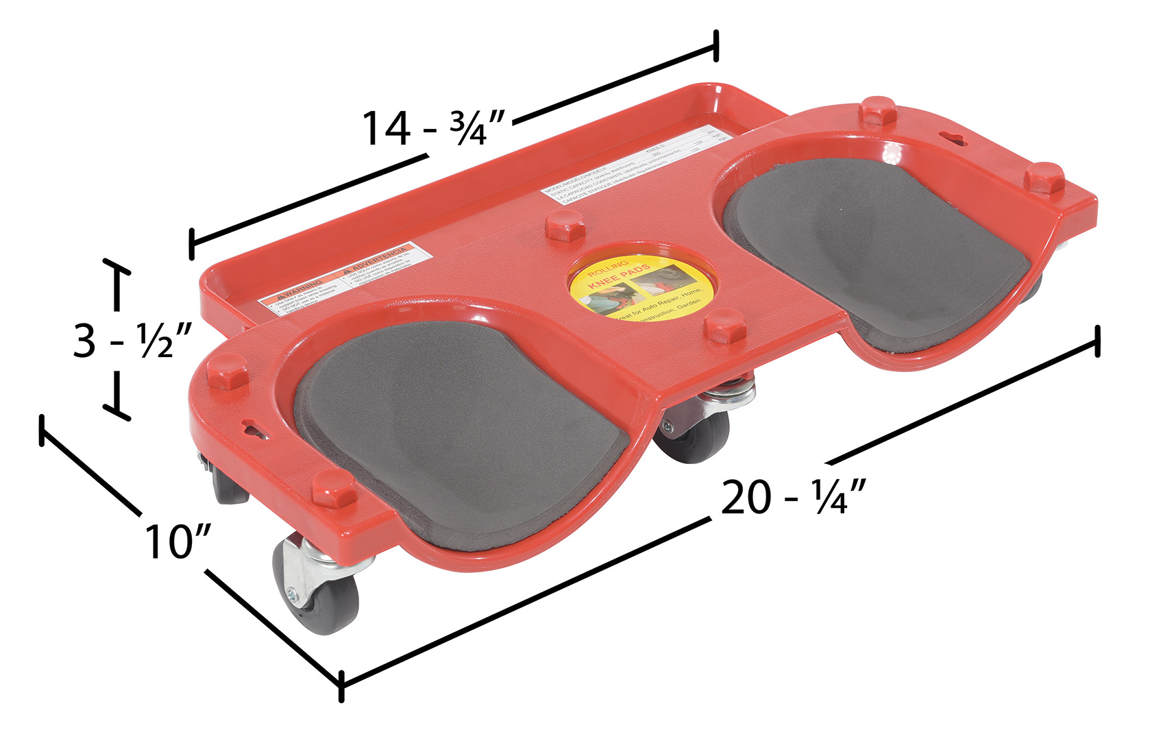 Rolling knee dolly is great for people working on their knees. Constructed of red molded plastic with foam cushioned knee cups. Ideal for maintenance departments, automotive garages, and furniture warehouses. Handy tool tray keeps tools in easy reach.