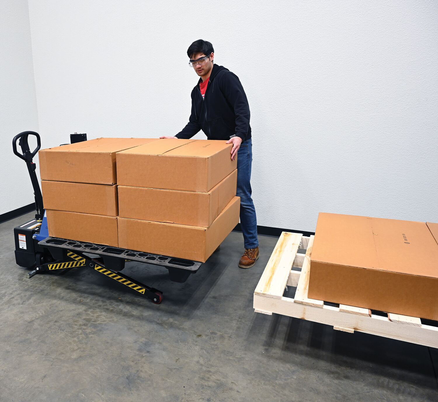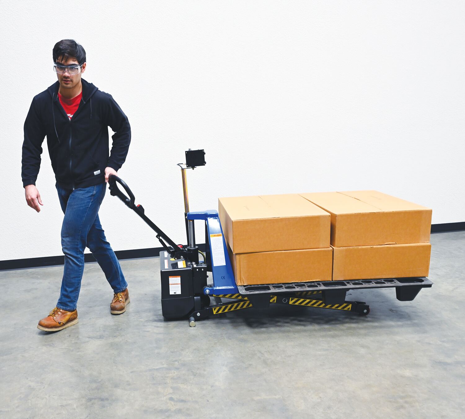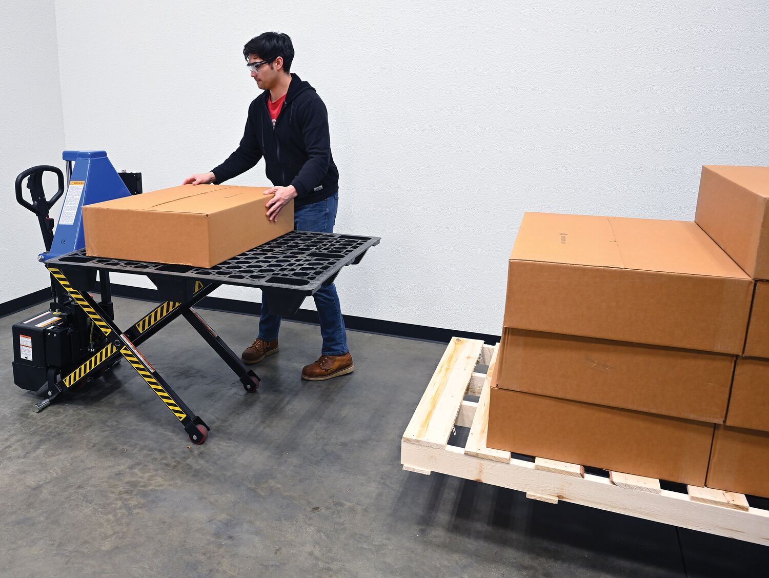 Steel DC Powered Tote Lift Photo Eye 62-1/4 In. x 29 In. x 51-1/4 In. 3000 Lb. Capacity Blue