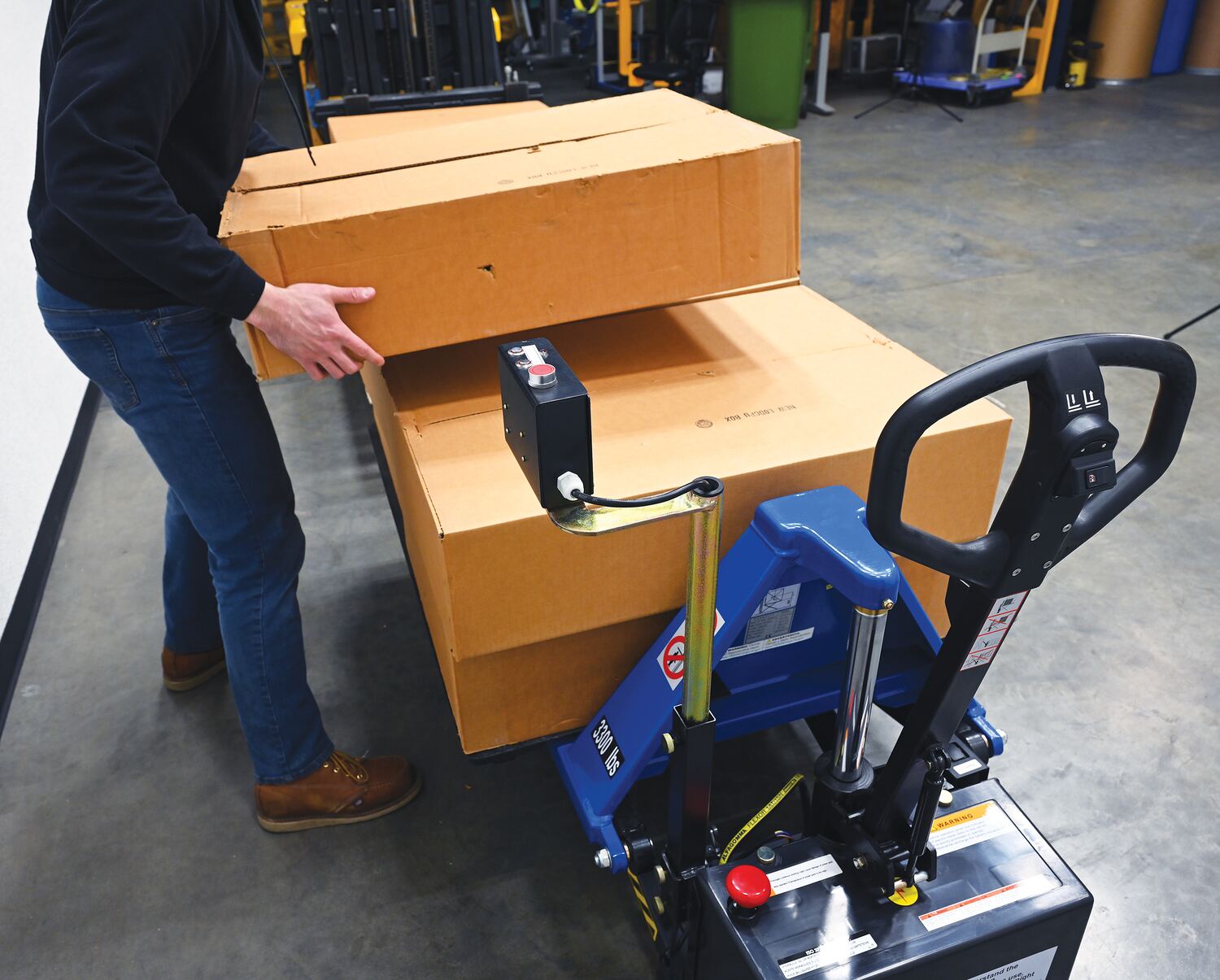 Whether your load is light, small, heavy, or large this tote lifter can manage the job! With its specifically designed structure, it is perfect for lifting open bottom skids, boxes, and baskets. Through a DC power supply, a simple rocker switch is used for raising and lowering. Not only that; but used in conjunction with the attached photo eye sensor, adjusting load heights has seldom been easier or more accurate. The photo eye sensor provides a visual representation of the tote lifters height while in the raising, lowering, or stationary process. An on-board battery charger is included to provide consistent power throughout the working day.
