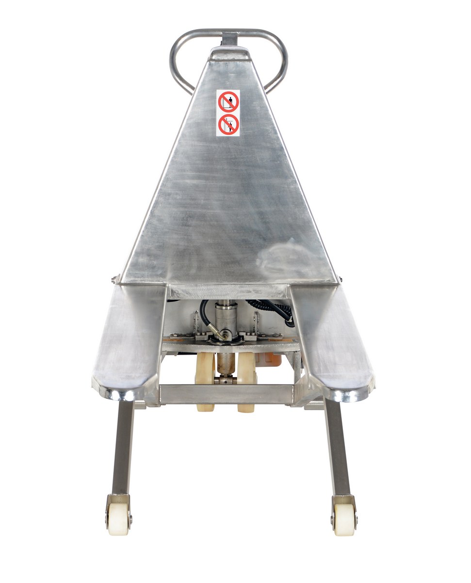 Stainless Steel DC Powered Tote Lift 63 In. x 26-3/4 In. x 46 In. 2000 Lb. Capacity BlueThe tote lifter is designed to lift open bottom skids, boxes, and baskets. Lifter is DC power with rocker switch to raise or lower. This DC powered unit includes an on-board battery charger. The side stabilizers lock lift in place when load is raised over a certain height.