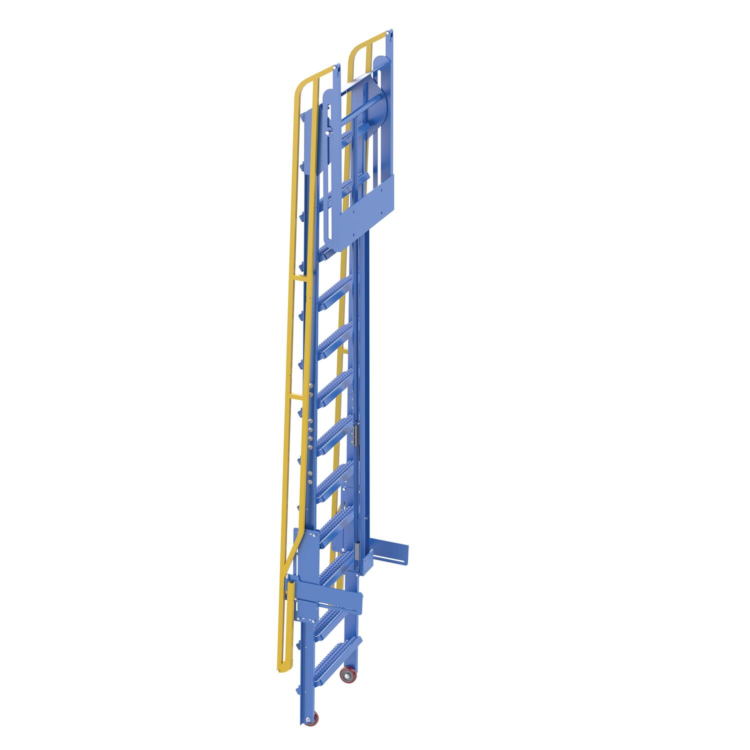 Steel Folding Mezzanine Ladder 120 In. Mezzanine Height 24-1/4 In. Step Width 350 Lb. Capacity BlueThe mezzanine ladders are used for infrequent usage to access mezzanines. They are ratcheted into climbing angle and back into stored position. The wheels roll on the ground when ratcheted and the handrails mechanically rise into climb position when ladder locks into position. Quickly extend and retract the ladder. The mezzanine ladder allows for quick installation with mounting bracket provided for bolt-on installation or welded installation. Customer must provide their mezzanine height at time of purchase. Baked-in powder-coated toughness. Meets or exceeds all OSHA requirements. Ships knockdown, some assembly required.