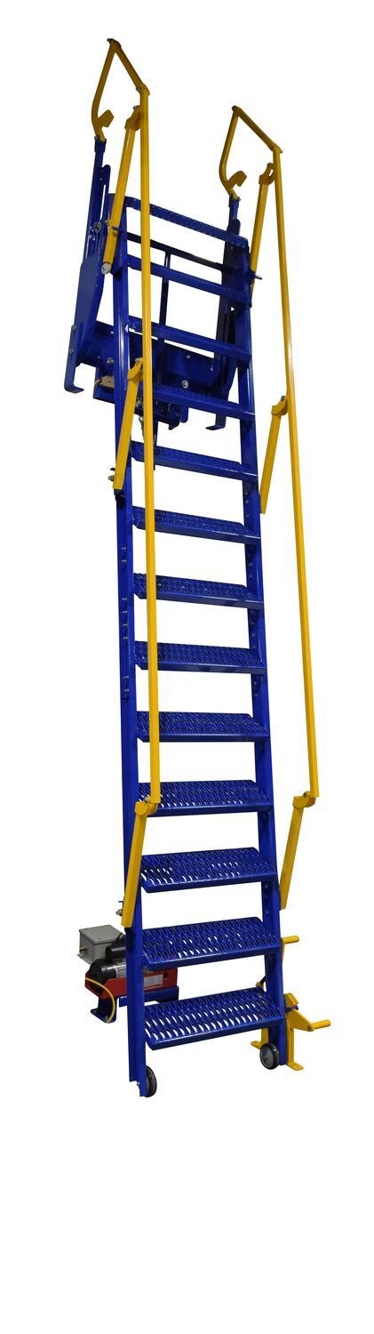 The powered mezzanine ladders are used for infrequent usage to access mezzanines. They are quickly powered into climbing angle and back into stored position. The wheels roll on the ground when ratcheted, and the handrails mechanically rise into climb position when the ladder locks into position. Quickly extend and retract the ladder with the handheld pendant. The mezzanine ladder allows for quick installation. The unit keeps a small distance from the wall for compact storage. Customer must provide their mezzanine height at the me of purchase. Baked in powder coat blue and yellow finish for added toughness.