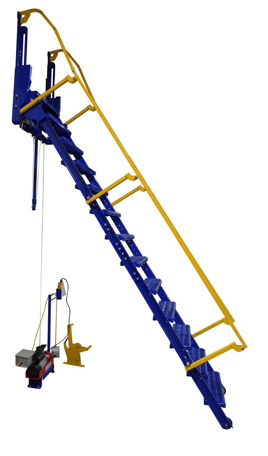 Steel Folding Mezzanine Ladder with 115V Power Storage 120 In. Mezzanine Height 23-5/8 In. Step Width 350 Lb. Capacity Blue & Yellow