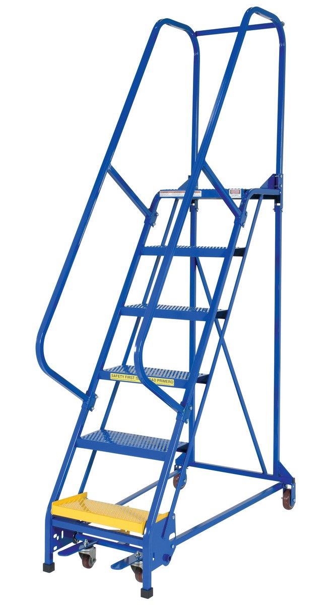 The standard slope ladder is a portable warehouse ladder for every-day use applications. Perforated steps, handrail included, welded square tubular steel construction with powder-coat blue finish. Rubber feet provided for floor protection. Unit has bottom step lock casters for safe use when climbing.
