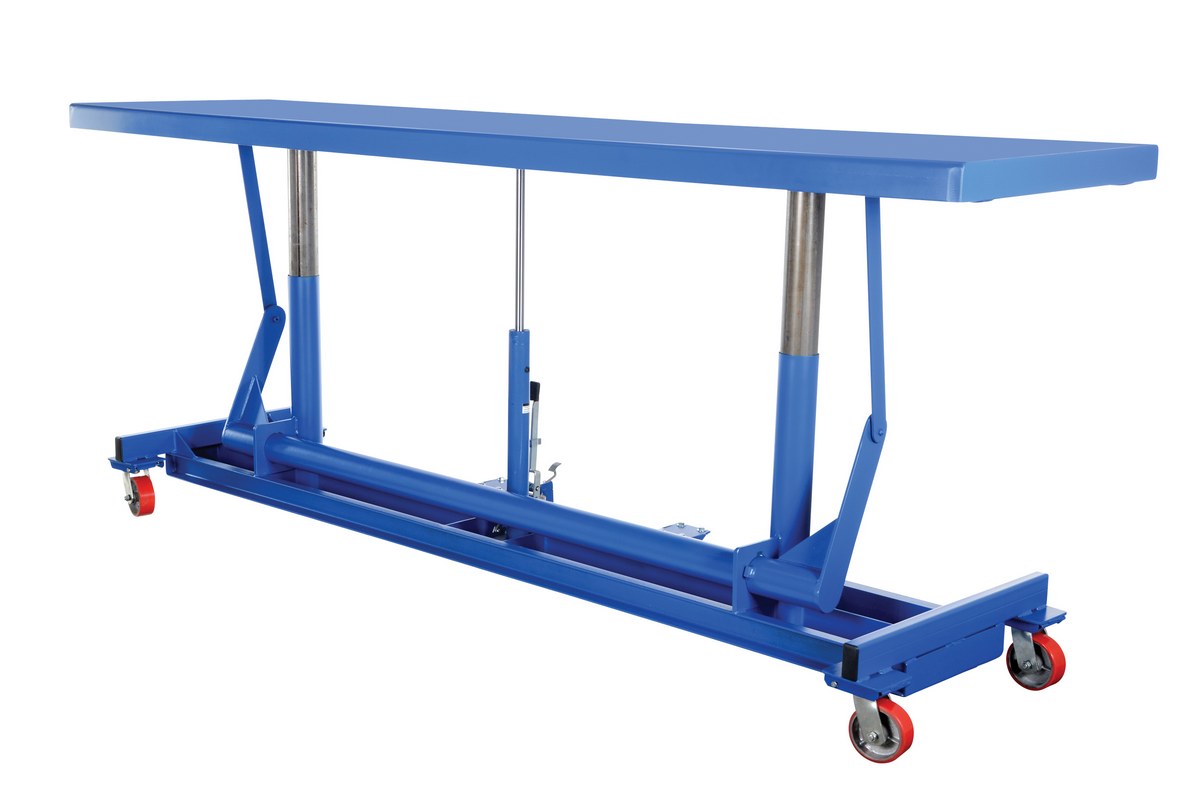 Steel Ergonomic Long Deck Cart 120 In. x 30-1/4 In. x 31 In. 2,000 Lb. Capacity BlueThe long deck cart is perfect for sheet and strip handling as well as ergonomic load positioning. The platform height is adjusted with manual hydraulic foot pump. Unit comes standard with four (4) swivel poly-on-steel casters and dual floor locks.