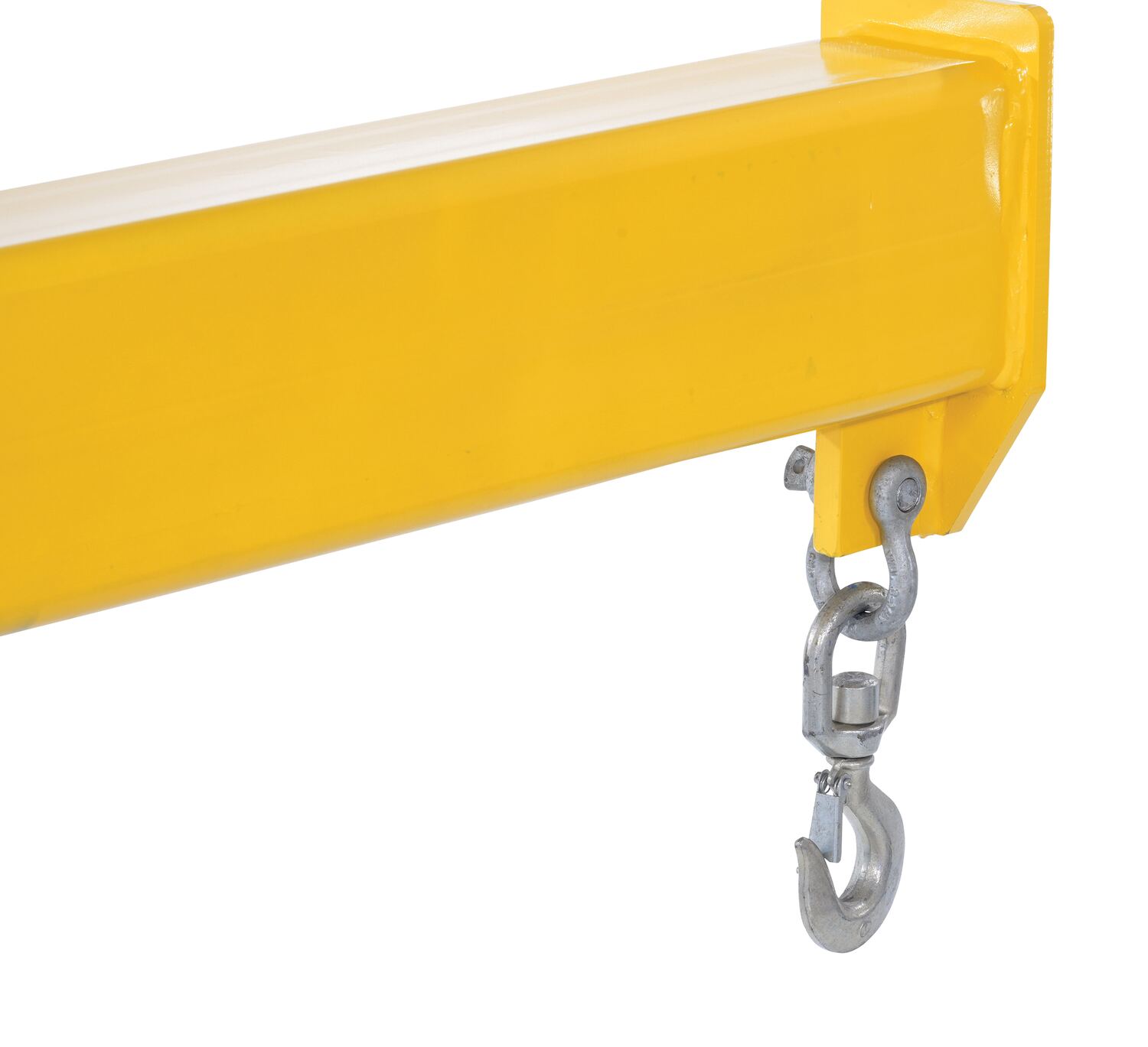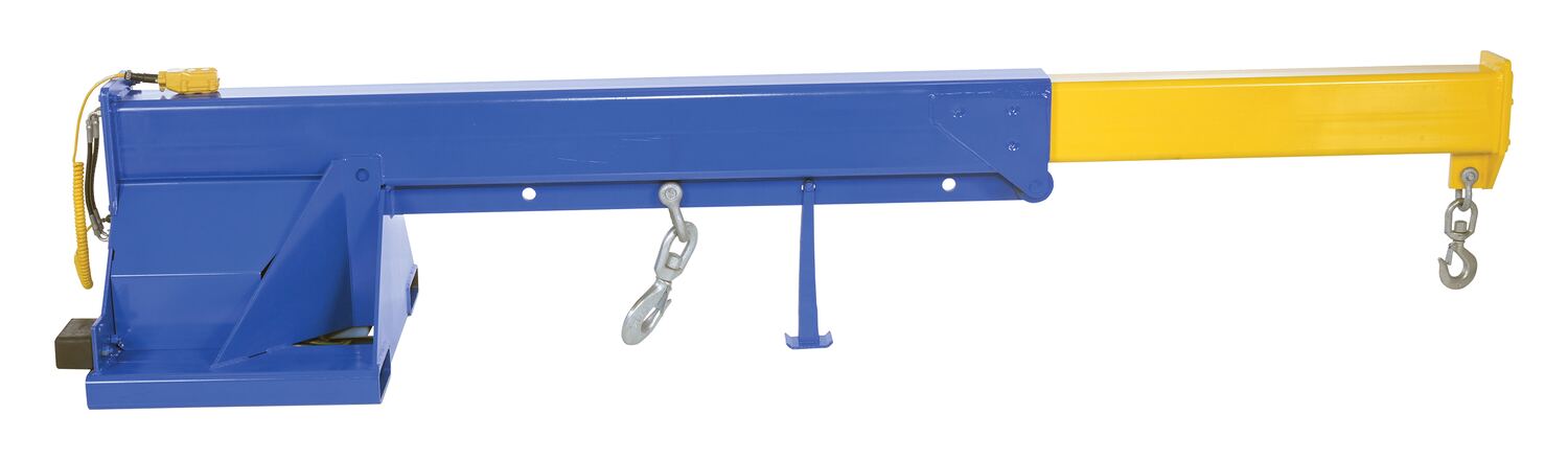The DC powered telescoping boom has all the benefits of the standard lifting boom, except now it has the capability of being powered. The DC powered design includes a power unit housed between the fork tubes and the outer boom. By using the handheld controller the boom can be extended or retracted. The hand held controller connects to the power unit via a pigtail cord. Painted for a smooth finish and to limit abrasion. Includes two (2) lifting hooks.